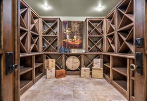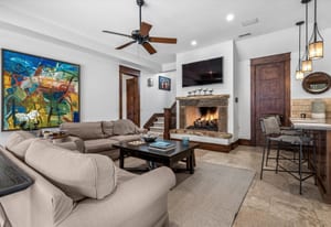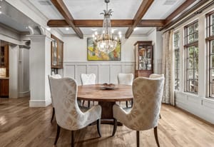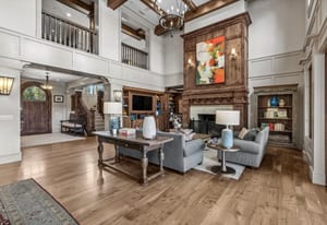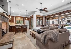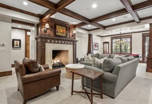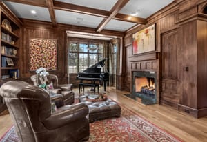 Highlights include a dramatic two-story great room with a 19-foot beamed ceiling, wood-burning fireplace, and accordion doors opening to outdoor entertaining areas, a gourmet kitchen with Sub-Zero and Wolf appliances plus butler’s pantry, a wood paneled library, and main-level office. The primary suite features a beamed ceiling, gas fireplace, sitting area with built-ins and coffee bar, private balcony, five-piece bath, and dual oversized closets.