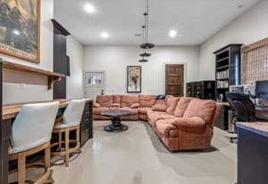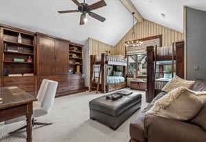 The guest house features a family room with fireplace opening to a covered patio, a full kitchen, private bedroom, pool bath, and an upper-level bunk room