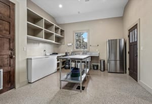 Outdoors, the estate provides multiple terraces, pool, spa, hot tub, fire pit, garden beds, dog run, and built-in grill. The finished five-car garage includes storage, bonus office with powder bath, and heated workshop/gear room.