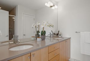 Two spacious bedrooms and two full bathrooms offer comfort and flexibility. The primary bedroom features a generous walk-in closet and a double vanity with shower, while the second bedroom includes an oversized closet and convenient access to the second full bath.