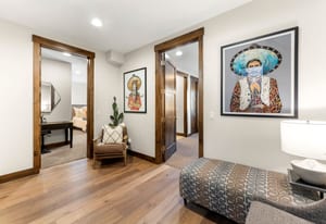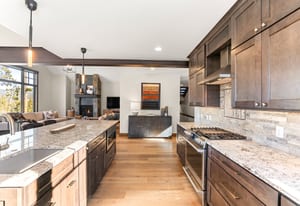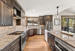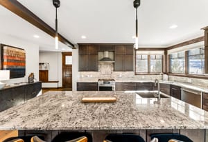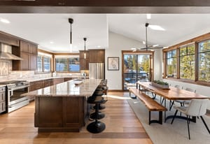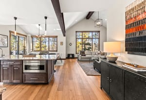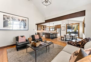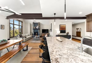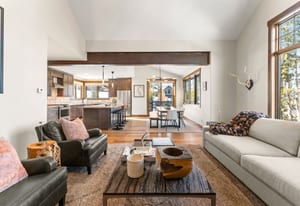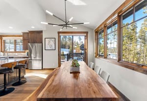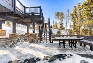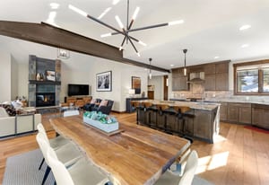 The open kitchen, living, and dining area opens to a large exterior deck with mountain views, ideal for indoor/outdoor living and entertaining. Enjoy easy access to the Breckenridge Golf Club with summer golf and winter Nordic skiing nearby.