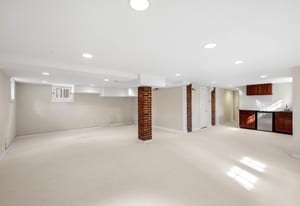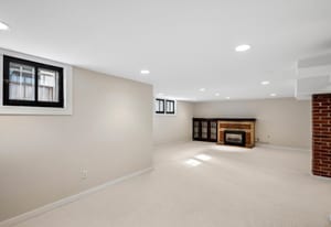 The bright, warm basement with gas fireplace and new modern carpet includes a large recreation room with wet bar and refrigerator, along with a bedroom, full bath, laundry room, and storage closets—providing additional flexibility for guests, work, or recreation.