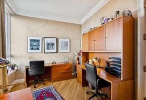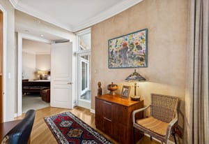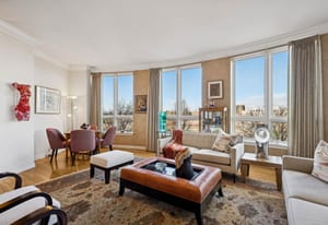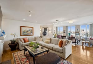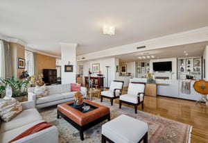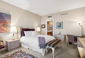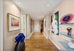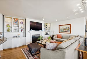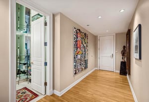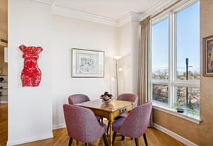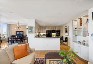 The extremely well designed floor plan features two bedrooms (ideally separated), two and a half bathrooms, and a wide, gallery-style entry ideal for showcasing art and collections. Hardwood flooring extends throughout the main living areas, complemented by plush carpeting in the bedrooms. A wall of bay windows anchors the living space, capturing sweeping views of the reimagined Cherry Creek corridor, Downtown Denver, and the mountains beyond.