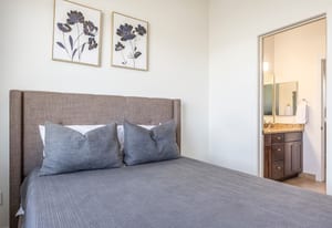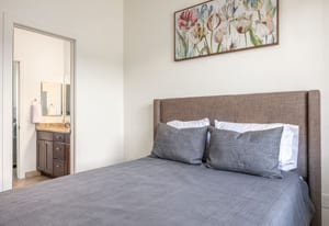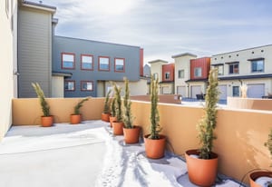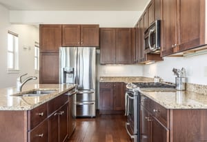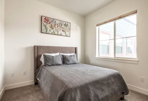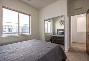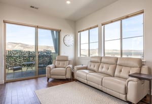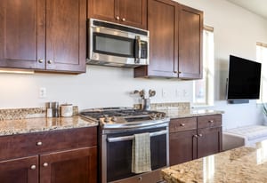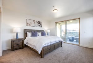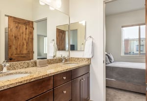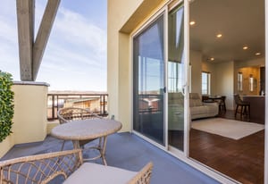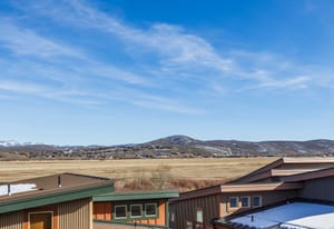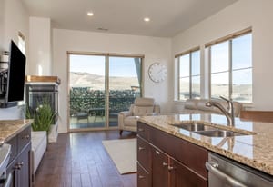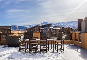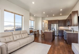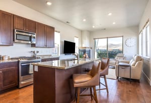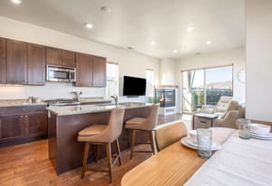 The interior showcases hardwood flooring and a modern kitchen with quartz countertops and stainless-steel appliances. Multiple outdoor living spaces include two private balconies, perfect for enjoying Park City’s four-season lifestyle.