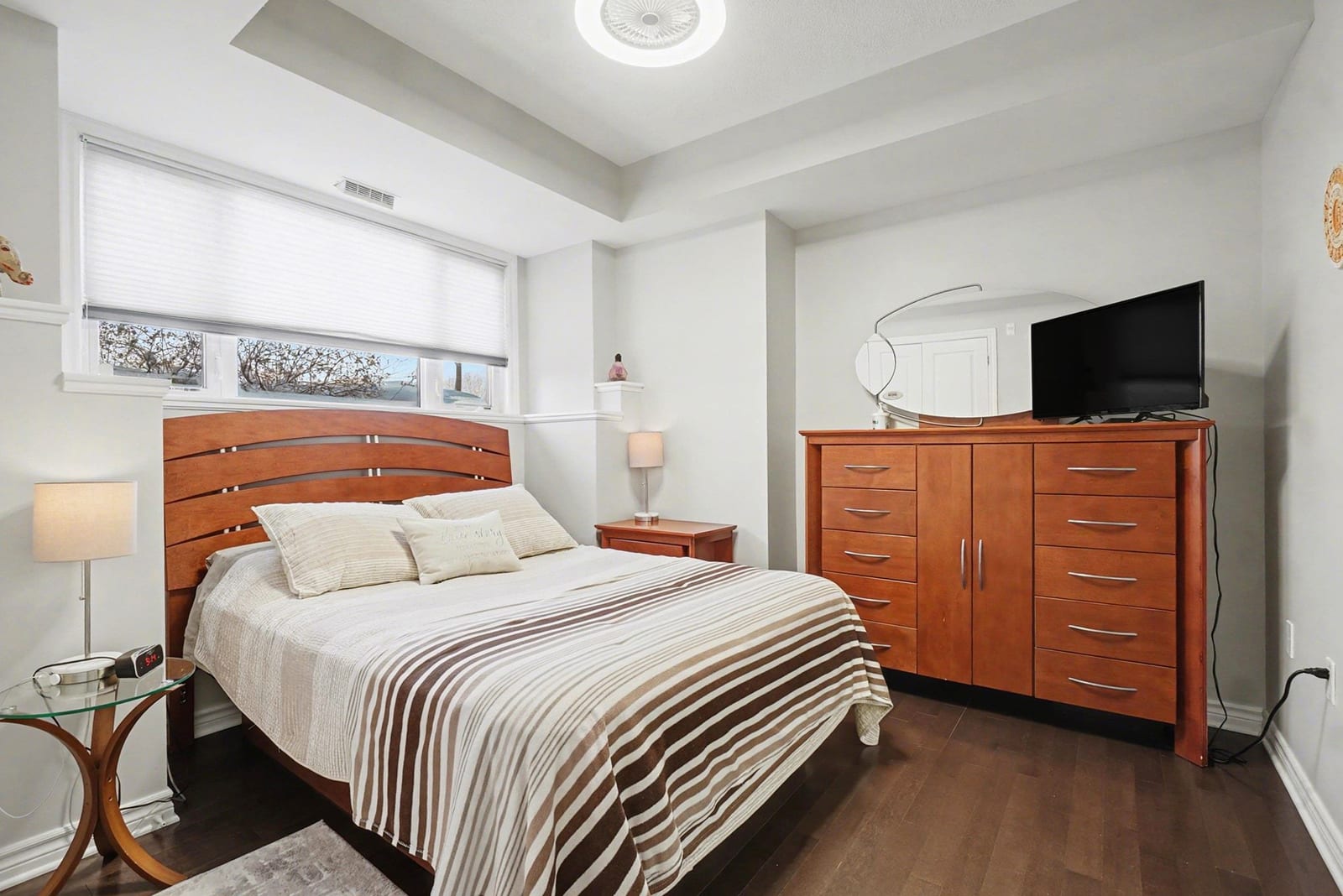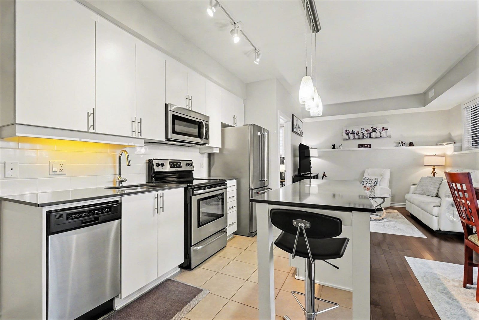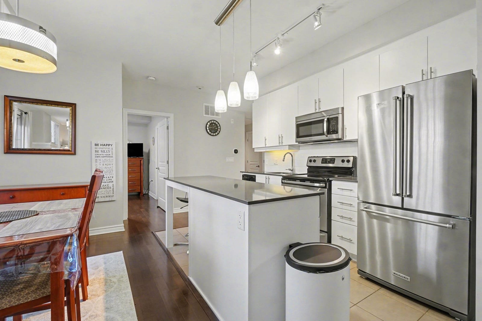 Perfectly Located Condo! Just steps away from the O-Train Cyrville Station, this exceptional unit features 2 bedrooms and 2 bathrooms, and is ready for you to move in. The bright, open-concept layout is accentuated by high ceilings, creating a spacious atmosphere. The kitchen is a highlight, showcasing quartz countertops, a breakfast bar, and stainless steel appliances. Elegant hardwood flooring flows seamlessly through the living and dining spaces, extending into both bedrooms. This condo offers the convenience of a 3-piece ensuite with an oversized shower and in-unit laundry. Step through the patio doors to discover a covered, ground-level private interlock terrace that overlooks a park, with no front neighbors. Furthermore, this home includes one parking space, one storage locker, and bike storage for added convenience.
