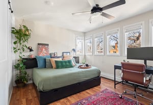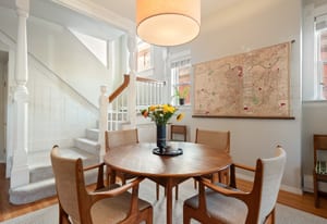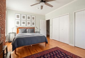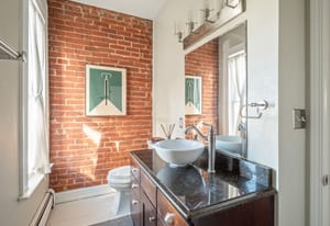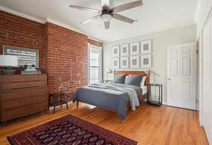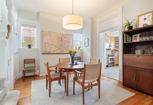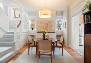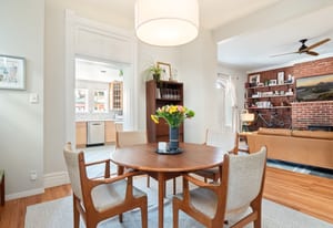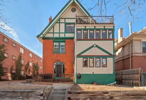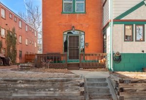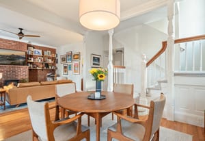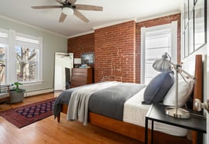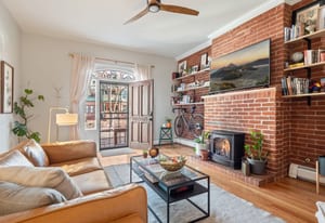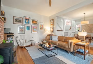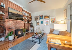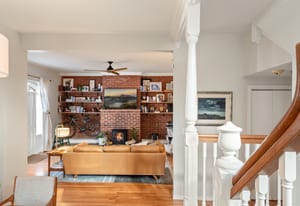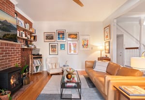 Inside, a two-story layout showcases original Victorian character alongside tasteful updates, featuring a wide open staircase, hardwood floors, exposed brick, a cozy fireplace, gallery walls, and soaring 12-foot ceilings. The spacious kitchen offers abundant natural light, newer appliances, and generous room to gather.