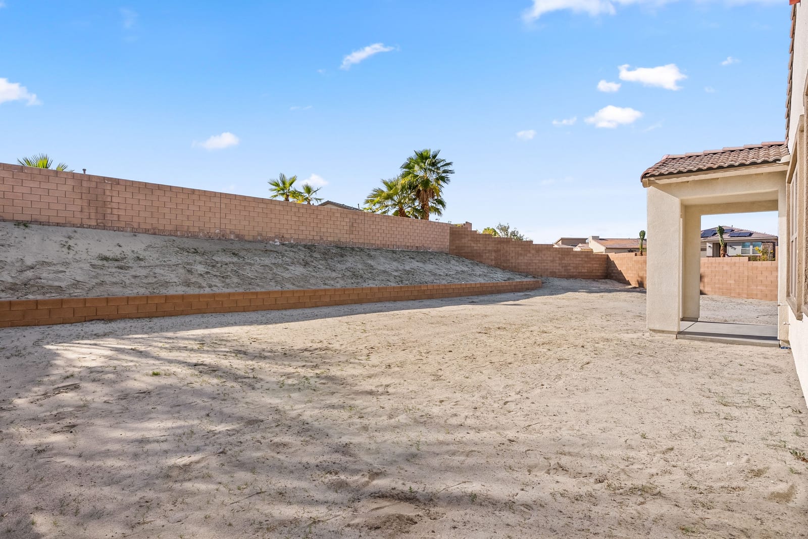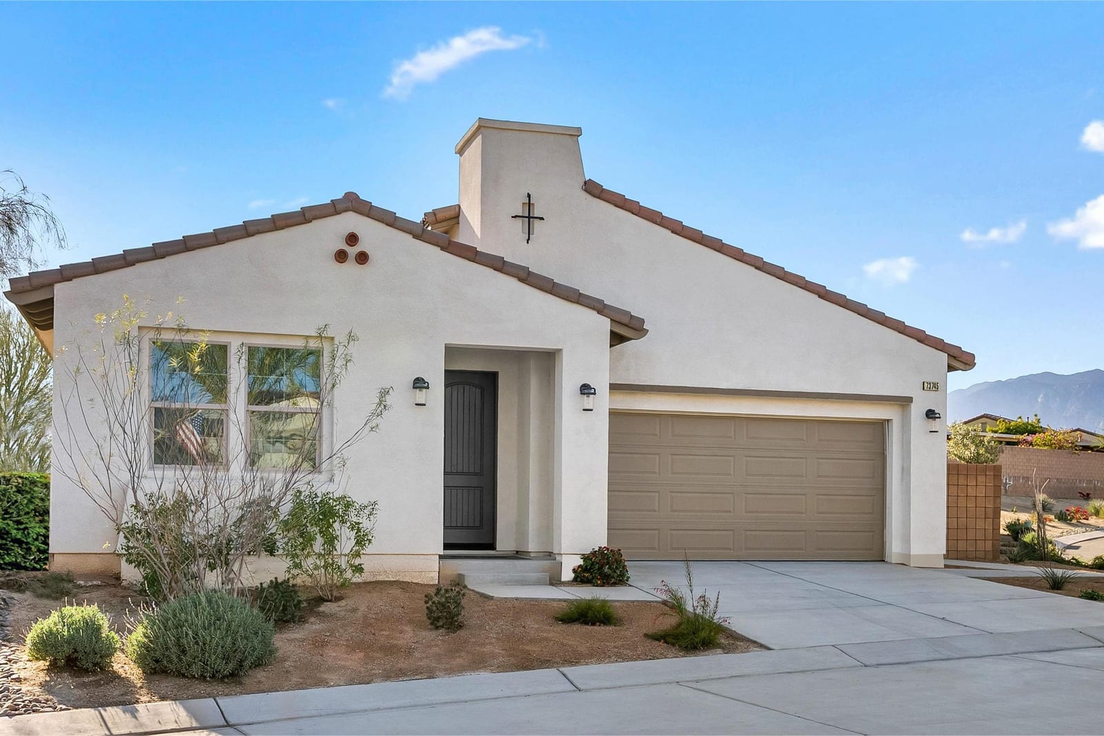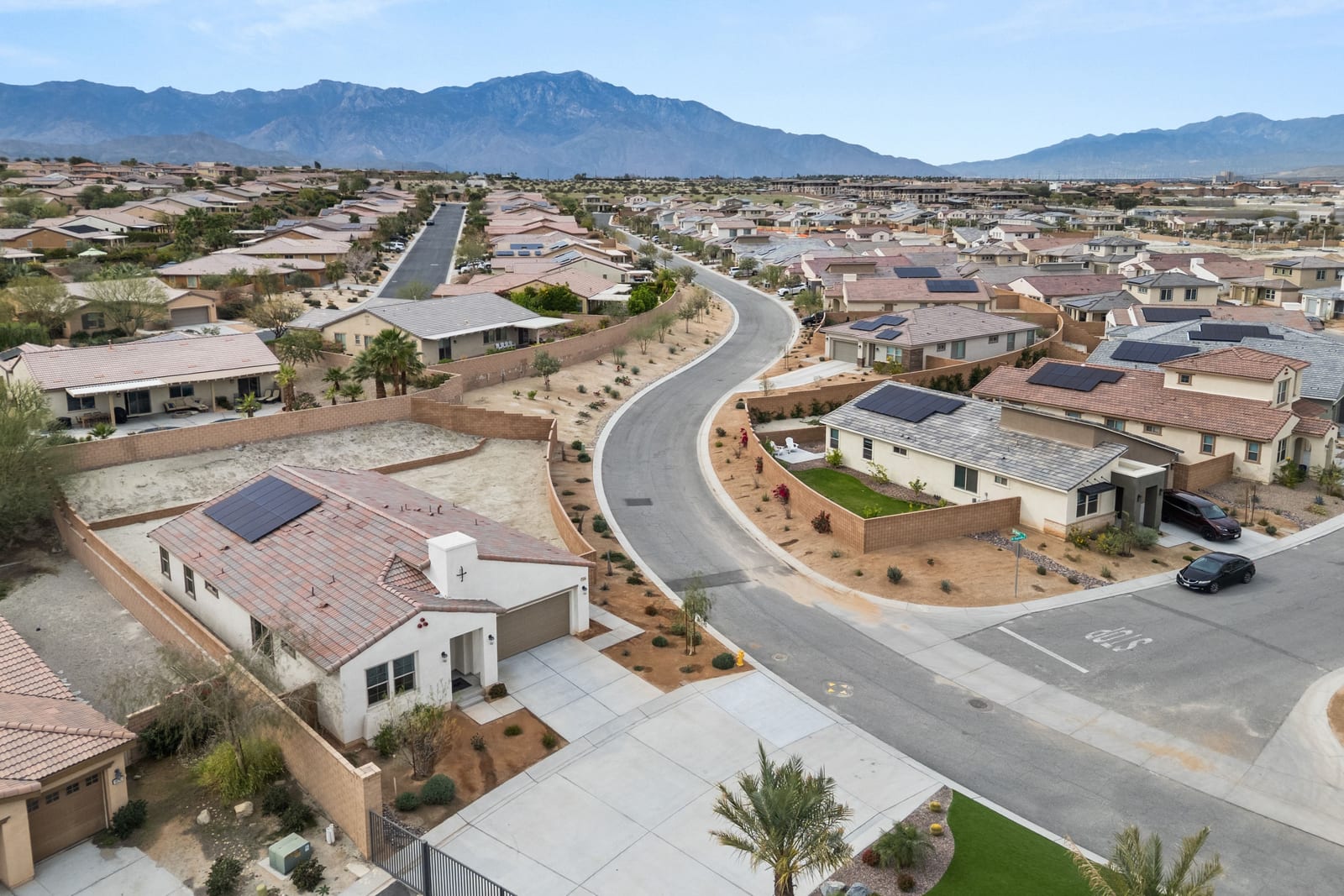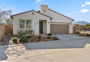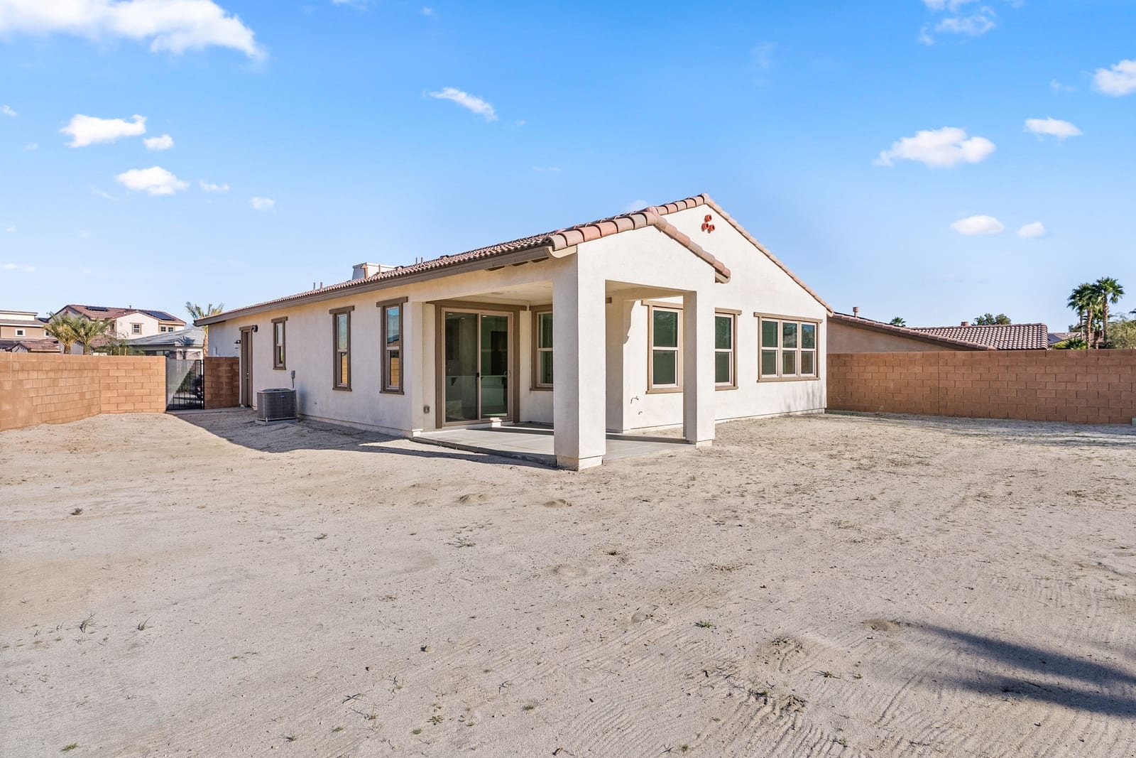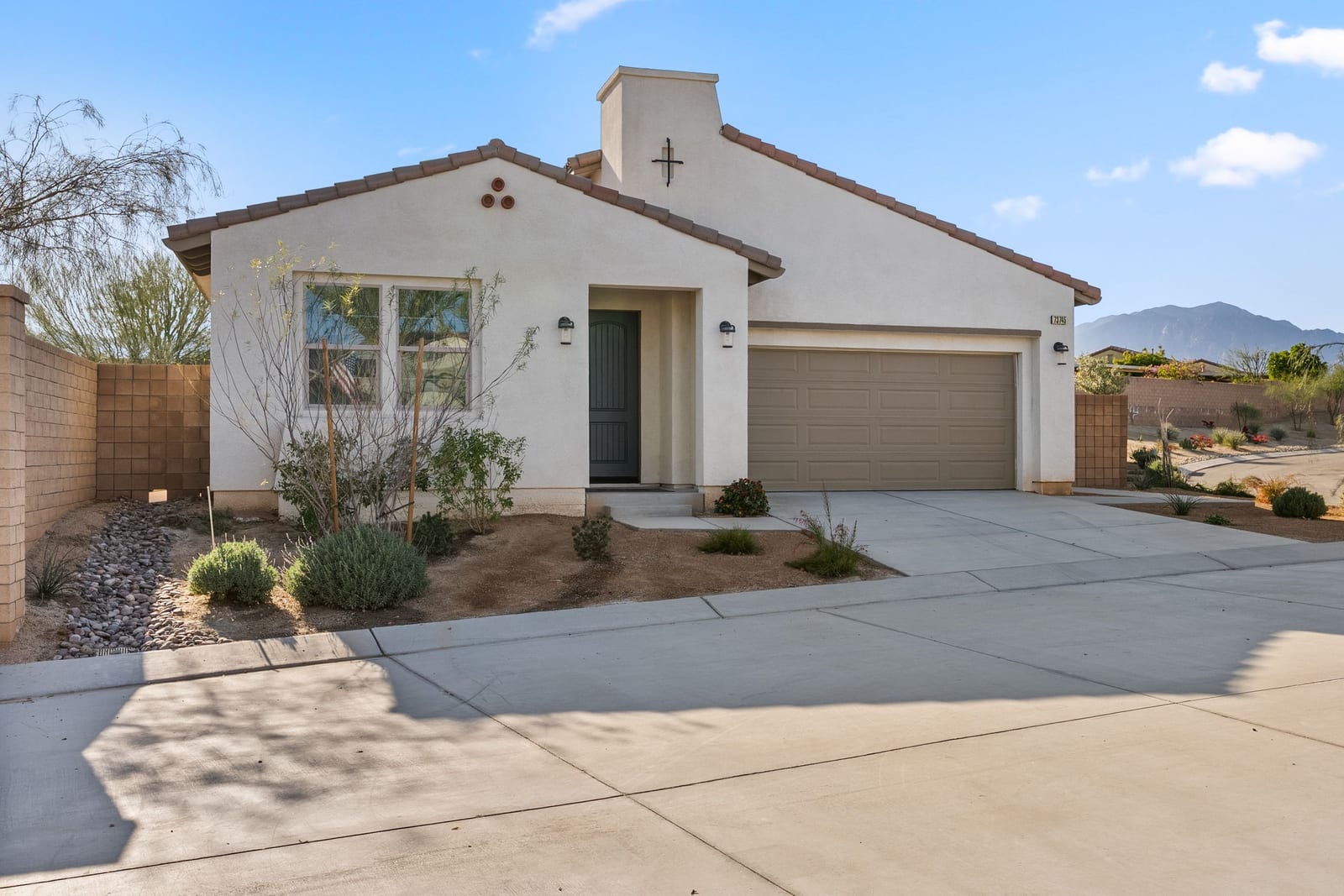 Brand-new and never lived in, this highly upgraded Ponderosa Home Builders residence is set on a rare, oversized private corner lot exceeding 11,300 sq. ft., offering a level of space, privacy, and future flexibility that is hard to find. The thoughtfully designed floor plan includes two bedrooms plus a den, providing flexibility for a home office, guest space, or additional living area. With ample room to add a pool, spa, and a ADU, this property delivers exceptional long-term lifestyle and investment potential. Built by Ponderosa Home Builders, a developer recognized for superior craftsmanship, structural quality, and enduring finishes, this great room-style home is thoughtfully designed for modern living and entertaining. The kitchen features quartz countertops, double ovens, a built-in refrigerator, under-cabinet lighting, a spacious walk-in pantry, and upgraded flooring, creating a refined yet highly functional living space. Eight-foot doors throughout enhance the home's open, upscale feel, while a tankless water heater and owned solar system contribute to long-term energy efficiency and comfort. Residents enjoy access to a newly completed clubhouse featuring a resort-style pool and spa, state-of-the-art fitness center, yoga lawn, and BBQ area. Conveniently located near shopping, dining, entertainment, and medical centers, with Palm Springs approximately twenty minutes away. A truly unique opportunity to own a pristine, newly built Ponderosa home offering uncommon privacy, an oversized corner lot, premium upgrades, and a level of construction quality that sets it apart!