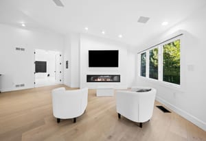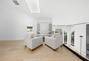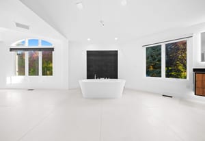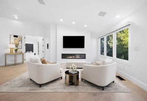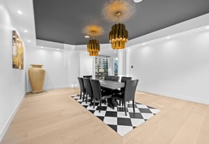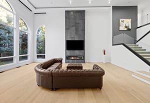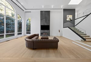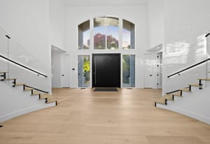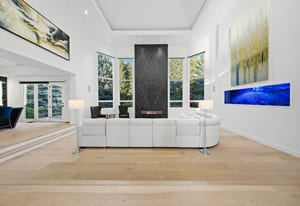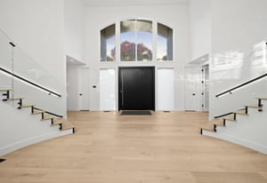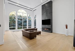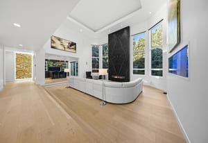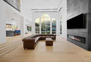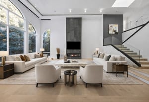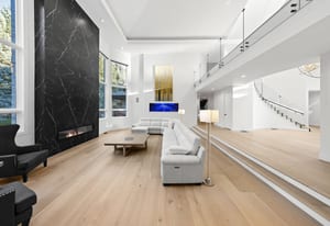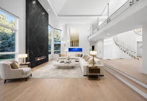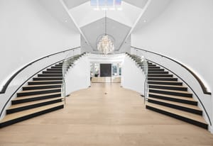 A circular driveway and manicured grounds lead to a dramatic entry featuring a dual glass Imperial staircase beneath soaring 30+ foot ceilings. Light-filled great rooms showcase floor-to-ceiling windows, sleek porcelain-encased fireplaces, and an effortless flow ideal for everyday living and grand entertaining.