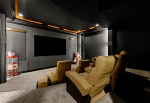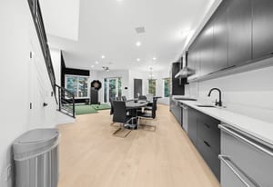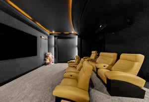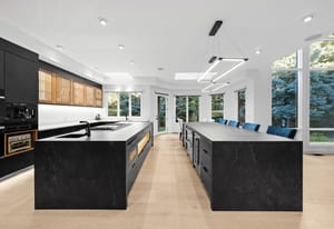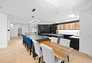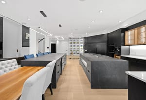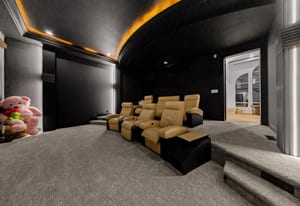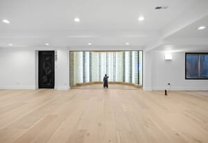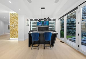 The main level offers a custom wet bar with illuminated displays and aquarium centerpiece, soundproof theater with tiered seating, glass-enclosed wine cellar with automated dispenser, and an entertainment wing with golf simulator and lounge. The chef’s kitchen boasts dual Dekton islands, Wolf and Sub-Zero appliances, built-in coffee station, butler’s pantry, and seamless indoor-outdoor connection.