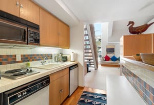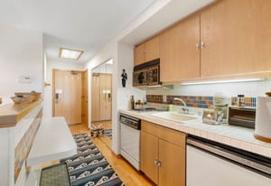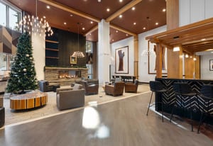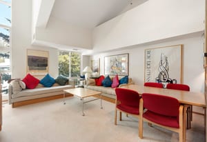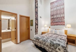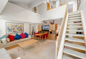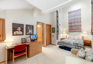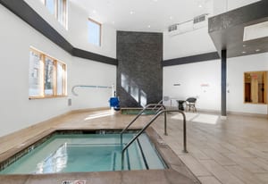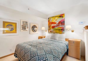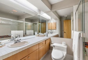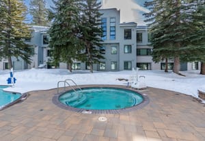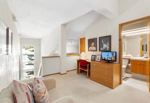 Upstairs, the open loft sleeping area features vaulted ceilings, a skylight, and a second full bathroom, creating a bright and airy atmosphere. Beyond the condo, Palisades Tahoe Lodge offers exclusive resort-style amenities, including five indoor/outdoor hot tubs, a heated outdoor pool (seasonal), a large fitness center, a steam room, and a sauna.
