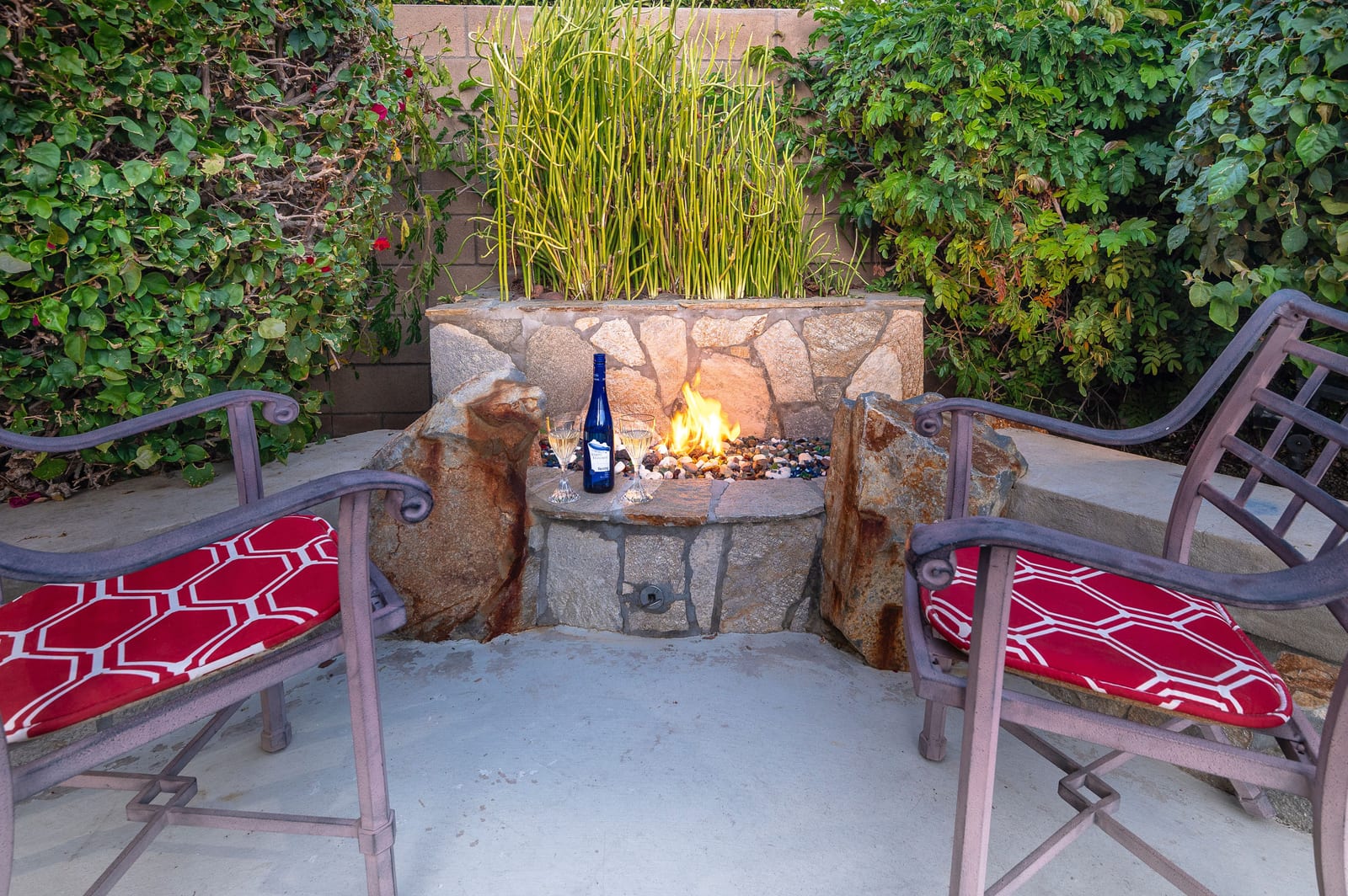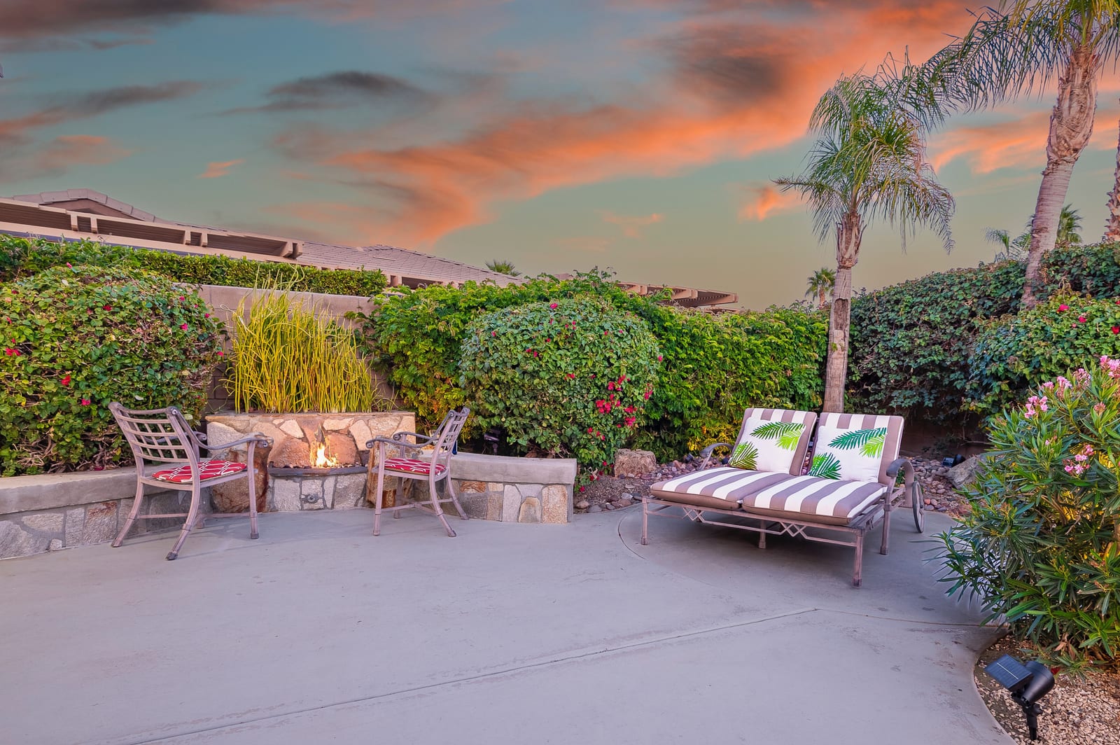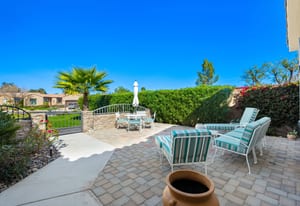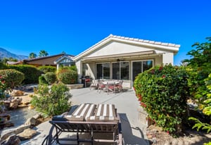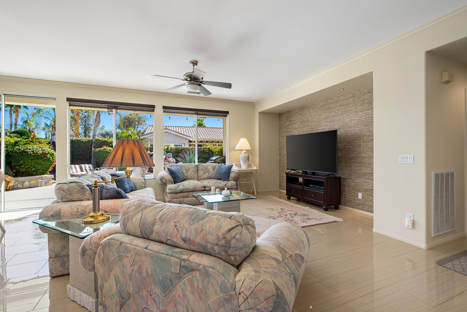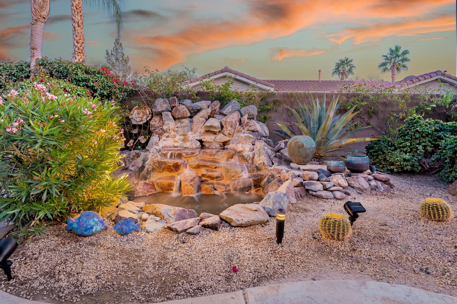 Beautifully designed and freshly updated this popular Monterey model with 1,693 SQ FT, 2-spacious bedrooms, 2-full bathrooms, and a sunny multi-purpose den with a sliding barn door to be used as a 3rd bedroom, office, or both. Located in the 55+ gated golf course community of Trilogy at La Quinta, this home is situated on large 7,840 SQ FT lot with a deep front on a small cul-de-sac and is brilliantly positioned to capture spectacular west-facing, mountain and sunset views from the expansive front courtyard, and east to south facing views from the private backyard. The home incorporates elevated design elements in an inspired blend of modern and classic styles, and the home is available turnkey furnished (per inventory). The classic and popular stucco exterior of the home features a seamless flow between indoor and multiple outdoor patio spaces. The property enters through a custom stack stone wall and wrought iron gateway into a spacious and welcoming courtyard with custom paver decking. Walk into the foyer and immediately experience the airy feeling of the open concept floor plan, the nine-foot ceilings, gleaming porcelain floors, and wall of windows that overlook the outdoor covered patio, soothing waterfalls, custom built-in fire pit, and beautiful mature desert landscaping. The custom automated awning extends the covered patio for comfortable dining and entertaining almost year-round. The great room is roomy and bright, with a large recessed media area that can easily accommodate future custom built-ins and even the largest of home theatre TV's. Spacious and updated, the kitchen is delightful and efficient with newer stainless appliances, including a pro grade 5-burner cooktop with custom range hood, refrigerator, microwave, and dishwasher, and water filtration. Perfect for cooking and entertaining, the kitchen has an abundance of rich wood cabinets and a pantry for storage. Custom polished granite countertops adorn the large kitchen island with counter seating and blends seamlessly with the custom glass tile backsplash. Slide out drawers keep pots and pans, cooking appliances right at hand. The den overlooks the front patio and mountain views. Light and cheerful with tall arched windows and shutters, an attractive barn door makes the room perfect for use as a 3rd bedroom for guests. The primary bedroom suite is spacious with picture windows overlooking the back yard landscape and rock waterfalls. The bathroom is updated with a contemporary flair.