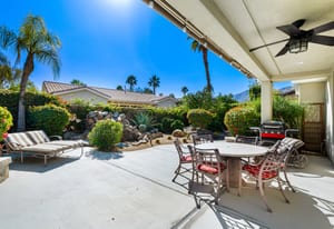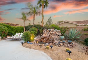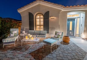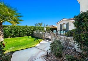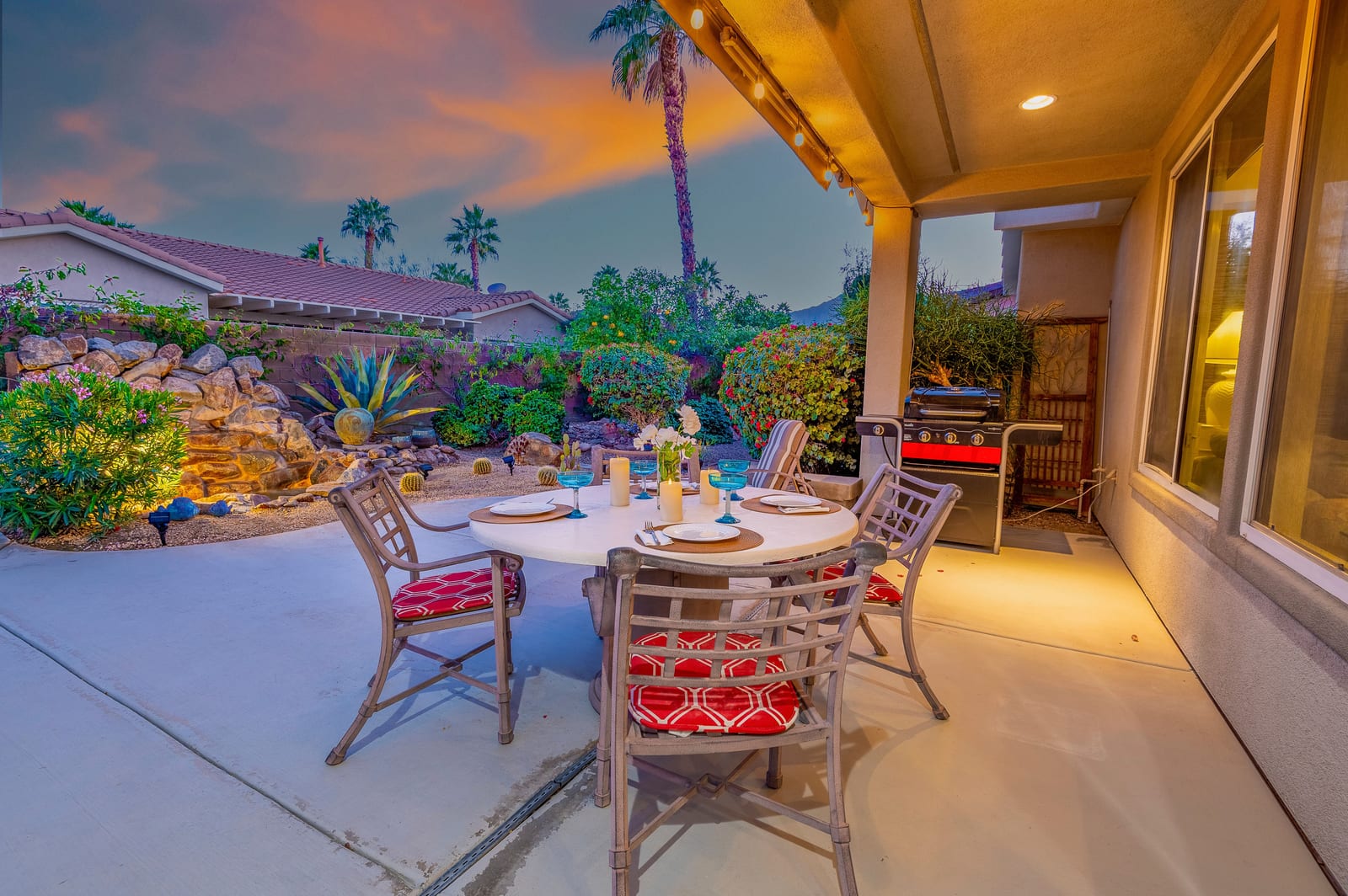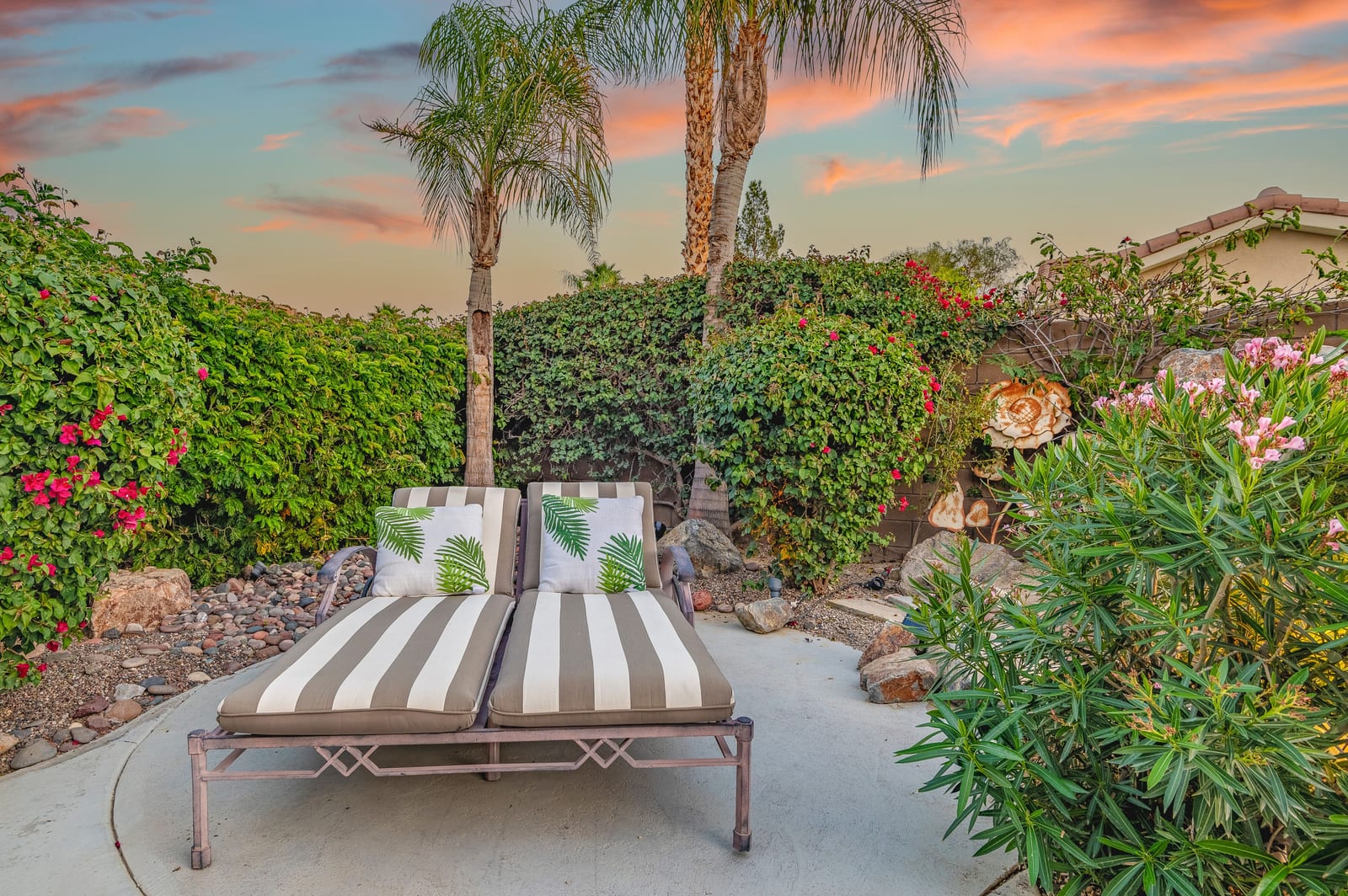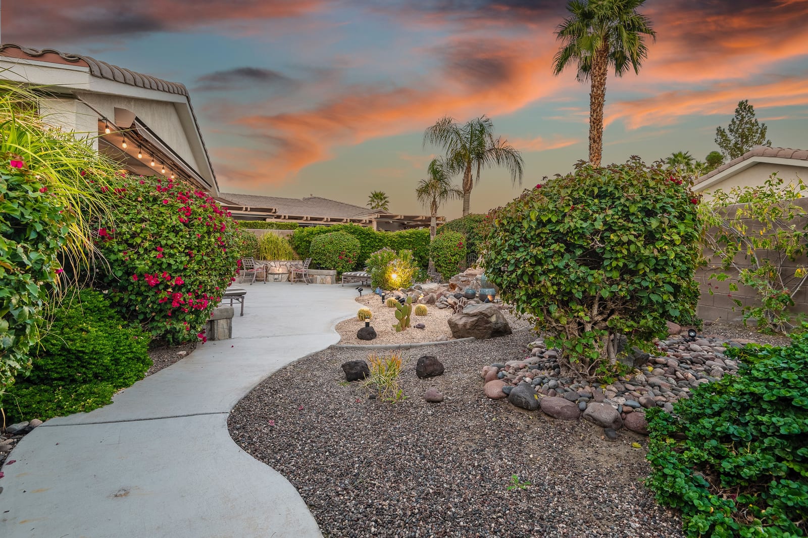 Beautifully designed and freshly updated this popular Monterey model with 1,693 SQ FT, 2-spacious bedrooms, 2-full bathrooms, and a sunny multi-purpose den with a sliding barn door to be used as a 3rd bedroom, office, or both. Located in the 55+ gated golf course community of Trilogy at La Quinta, this home is situated on large 7,840 SQ FT lot with a deep front on a small cul-de-sac and is brilliantly positioned to capture spectacular west-facing, mountain and sunset views from the expansive front courtyard, and east to south facing views from the private backyard. The home incorporates elevated design elements in an inspired blend of modern and classic styles, and the home is available turnkey furnished (per inventory). The classic and popular stucco exterior of the home features a seamless flow between indoor and multiple outdoor patio spaces. The property enters through a custom stack stone wall and wrought iron gateway into a spacious and welcoming courtyard with custom paver decking. Walk into the foyer and immediately experience the airy feeling of the open concept floor plan, the nine-foot ceilings, gleaming porcelain floors, and wall of windows that overlook the outdoor covered patio, soothing waterfalls, custom built-in fire pit, and beautiful mature desert landscaping. The custom automated awning extends the covered patio for comfortable dining and entertaining almost year-round. The great room is roomy and bright, with a large recessed media area that can easily accommodate future custom built-ins and even the largest of home theatre TV's. Spacious and updated, the kitchen is delightful and efficient with newer stainless appliances, including a pro grade 5-burner cooktop with custom range hood, refrigerator, microwave, and dishwasher, and water filtration. Perfect for cooking and entertaining, the kitchen has an abundance of rich wood cabinets and a pantry for storage. Custom polished granite countertops adorn the large kitchen island with counter seating and blends seamlessly with the custom glass tile backsplash. Slide out drawers keep pots and pans, cooking appliances right at hand. The den overlooks the front patio and mountain views. Light and cheerful with tall arched windows and shutters, an attractive barn door makes the room perfect for use as a 3rd bedroom for guests. The primary bedroom suite is spacious with picture windows overlooking the back yard landscape and rock waterfalls. The bathroom is updated with a contemporary flair.