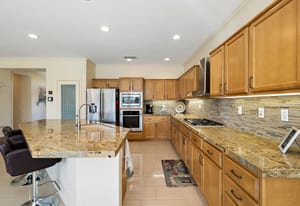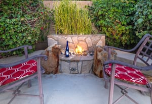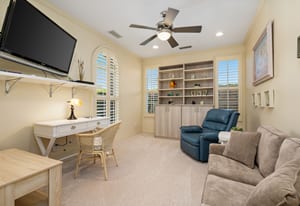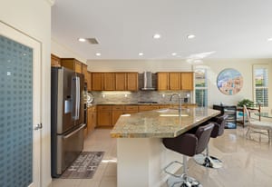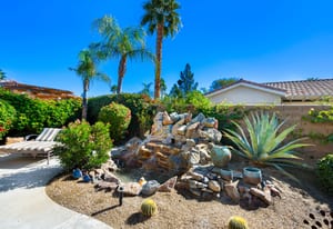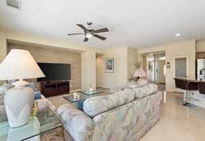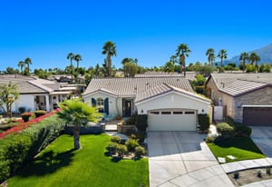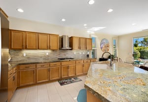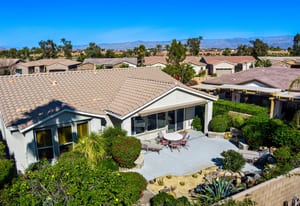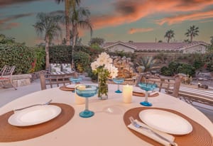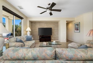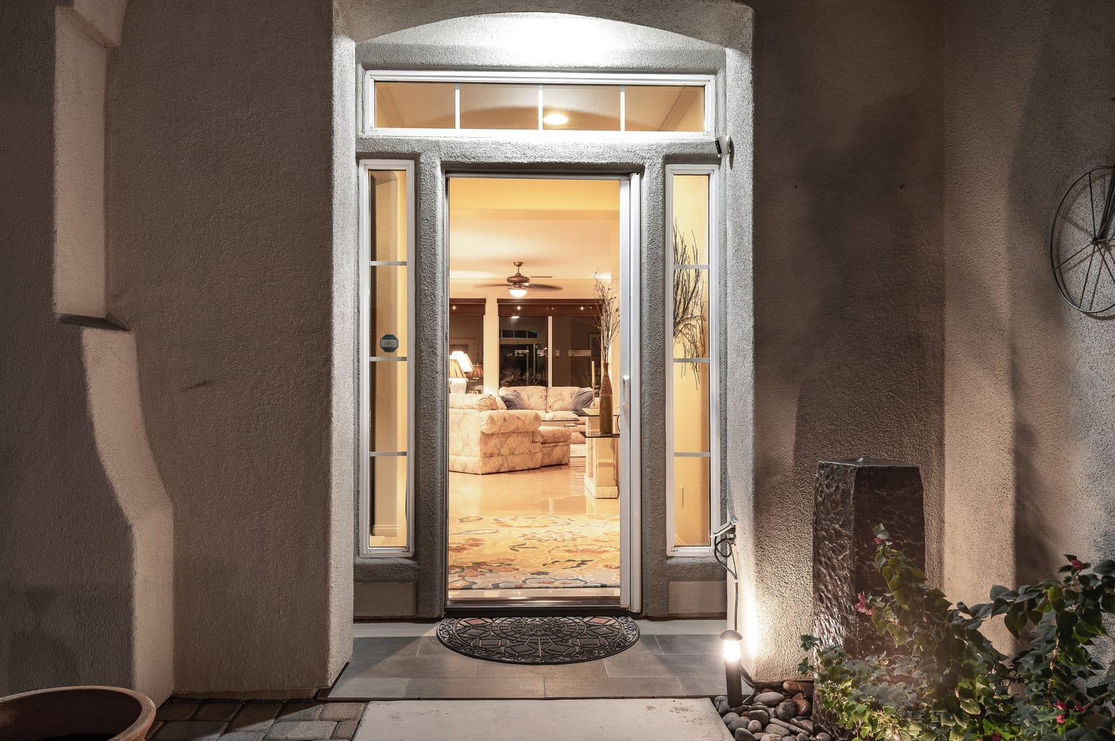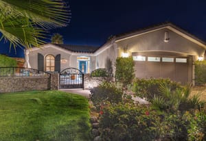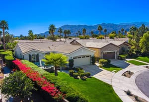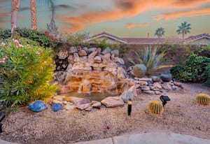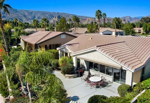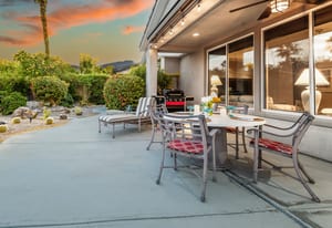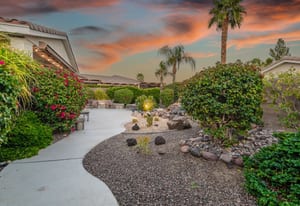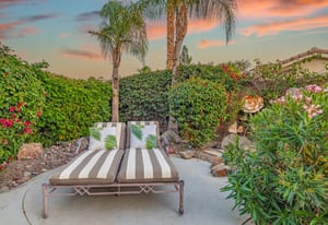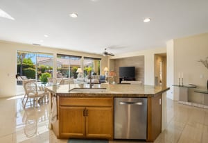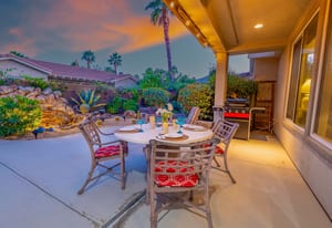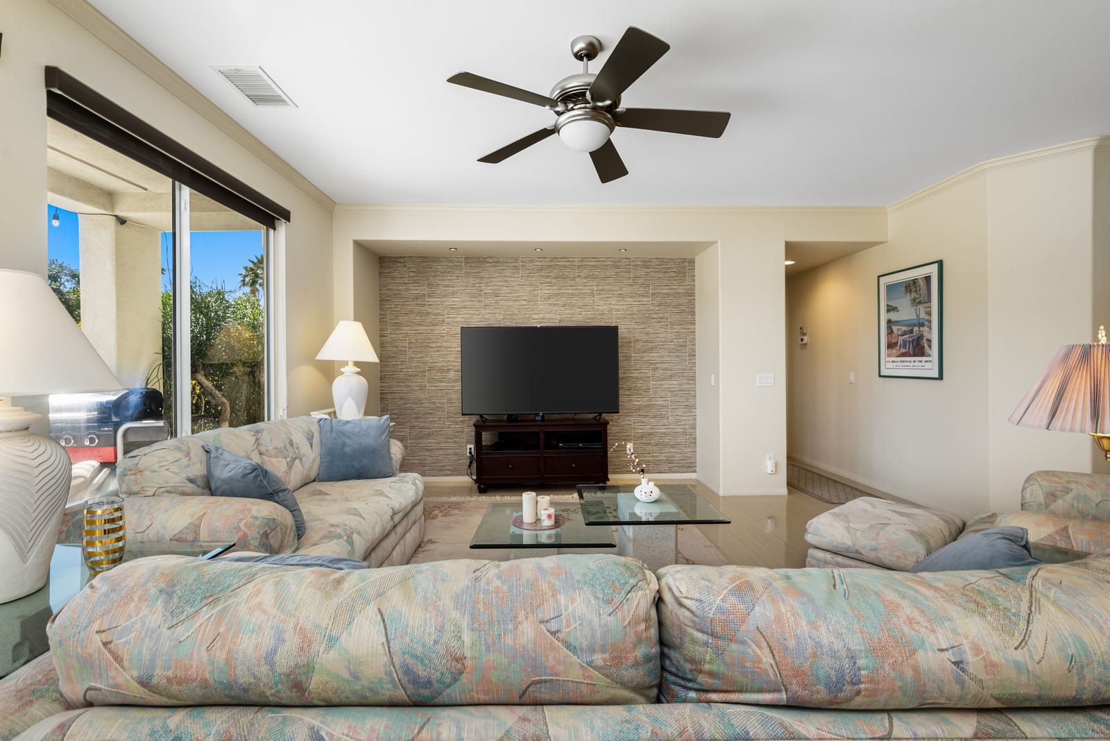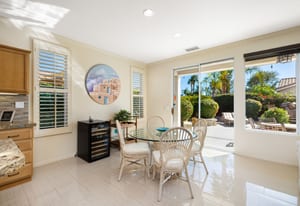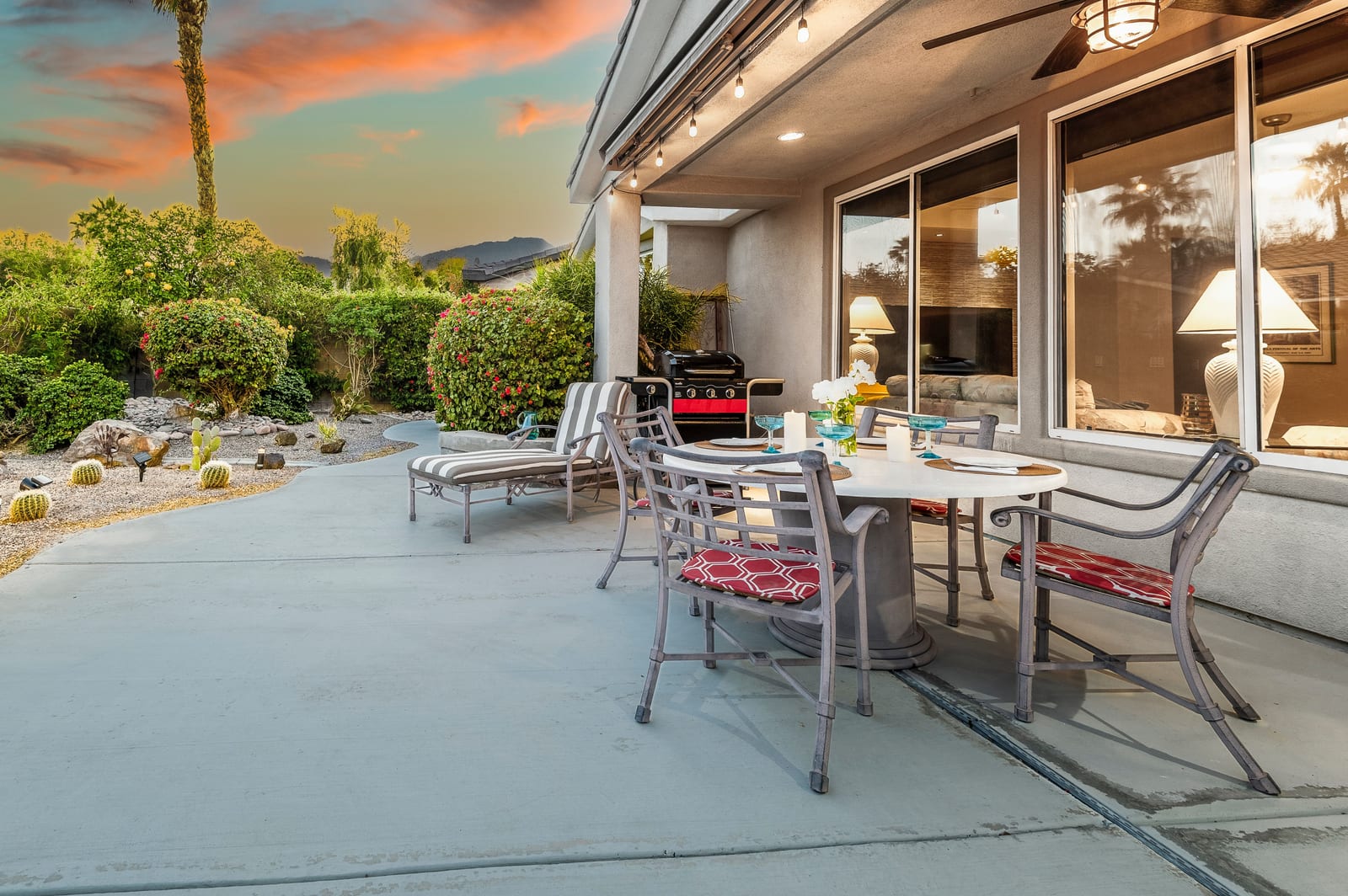 Beautifully designed and freshly updated this popular Monterey model with 1,693 SQ FT, 2-spacious bedrooms, 2-full bathrooms, and a sunny multi-purpose den with a sliding barn door to be used as a 3rd bedroom, office, or both. Located in the 55+ gated golf course community of Trilogy at La Quinta, this home is situated on large 7,840 SQ FT lot with a deep front on a small cul-de-sac and is brilliantly positioned to capture spectacular west-facing, mountain and sunset views from the expansive front courtyard, and east to south facing views from the private backyard. The home incorporates elevated design elements in an inspired blend of modern and classic styles, and the home is available turnkey furnished (per inventory). The classic and popular stucco exterior of the home features a seamless flow between indoor and multiple outdoor patio spaces. The property enters through a custom stack stone wall and wrought iron gateway into a spacious and welcoming courtyard with custom paver decking. Walk into the foyer and immediately experience the airy feeling of the open concept floor plan, the nine-foot ceilings, gleaming porcelain floors, and wall of windows that overlook the outdoor covered patio, soothing waterfalls, custom built-in fire pit, and beautiful mature desert landscaping. The custom automated awning extends the covered patio for comfortable dining and entertaining almost year-round. The great room is roomy and bright, with a large recessed media area that can easily accommodate future custom built-ins and even the largest of home theatre TV's. Spacious and updated, the kitchen is delightful and efficient with newer stainless appliances, including a pro grade 5-burner cooktop with custom range hood, refrigerator, microwave, and dishwasher, and water filtration. Perfect for cooking and entertaining, the kitchen has an abundance of rich wood cabinets and a pantry for storage. Custom polished granite countertops adorn the large kitchen island with counter seating and blends seamlessly with the custom glass tile backsplash. Slide out drawers keep pots and pans, cooking appliances right at hand. The den overlooks the front patio and mountain views. Light and cheerful with tall arched windows and shutters, an attractive barn door makes the room perfect for use as a 3rd bedroom for guests. The primary bedroom suite is spacious with picture windows overlooking the back yard landscape and rock waterfalls. The bathroom is updated with a contemporary flair.