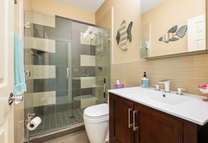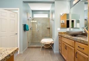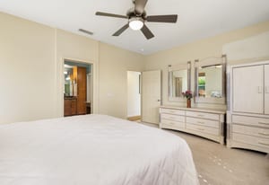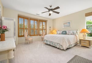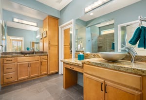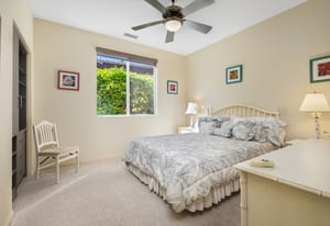 Custom tile floors, decorator tiled walk-in shower with bench seat, dual vanities with granite, raised glass bowl sinks, and cool contemporary faucets. A linen closet and large walk-in closet complete the bedroom suite. The second guest bedroom is roomy with a closet and a newly updated full bath. The laundry is in a separate room with deep sink that steps out to the attached garage with space for two vehicles and a golf cart. A rare and beautiful property!