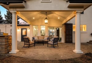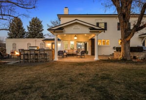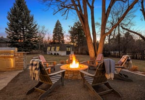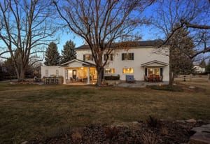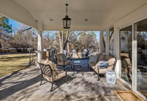 The home spans 5,126 square feet with six bedrooms and four baths, designed for both everyday comfort and effortless gatherings. The main level flows seamlessly to multiple outdoor living areas, including a covered patio that extends the home year-round and a secondary patio complete with built-in grill and fire pit—perfect for the Colorado lifestyle.