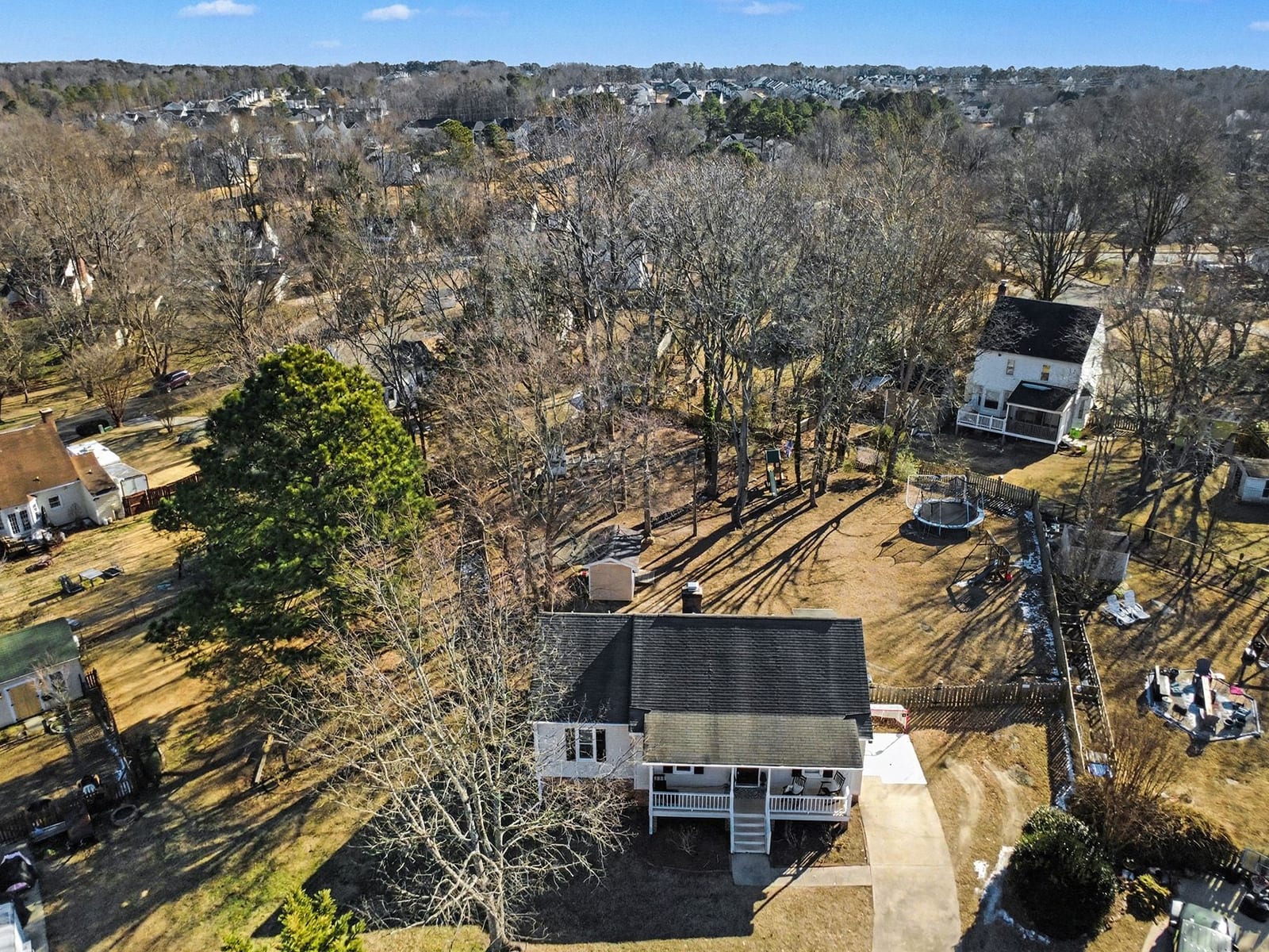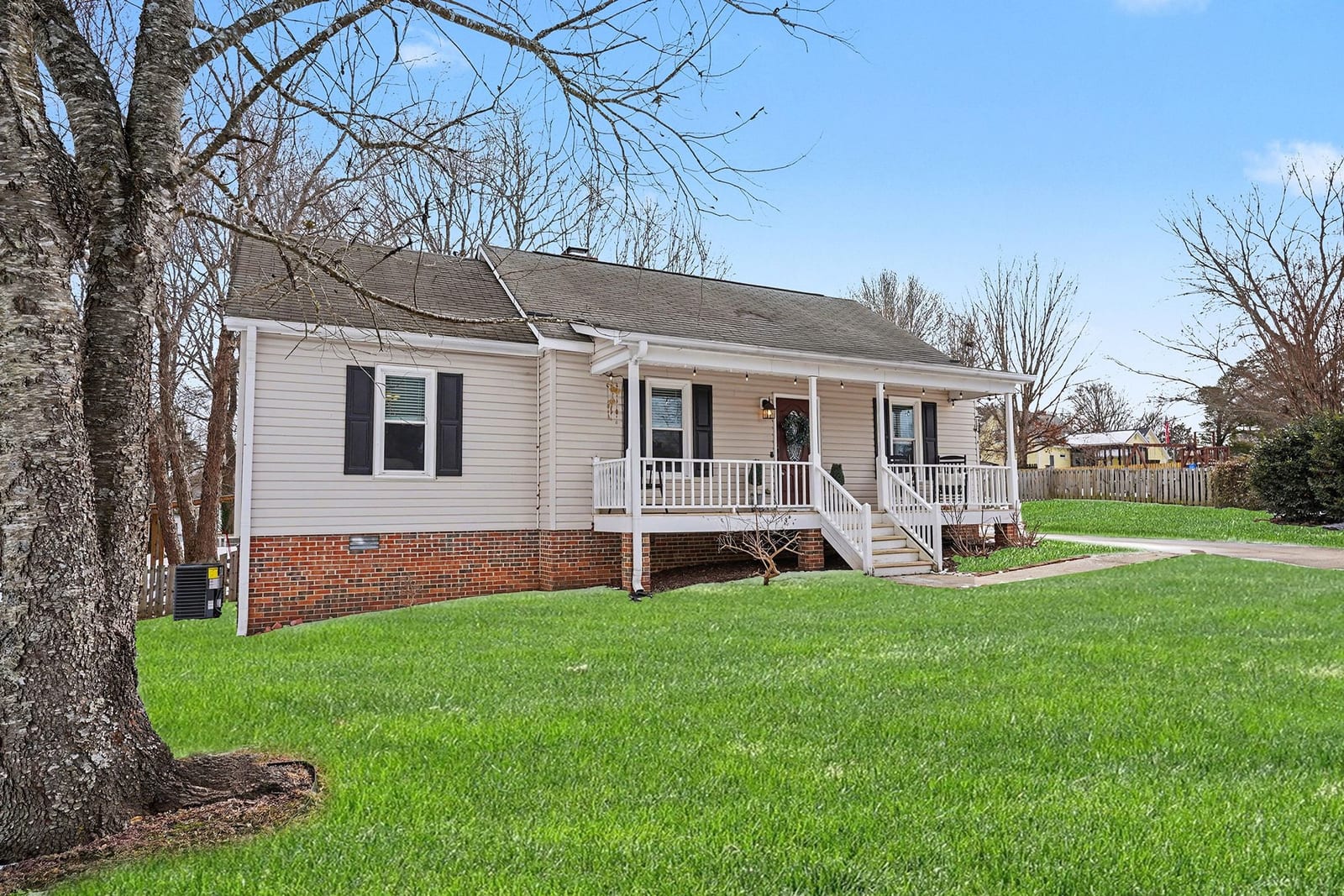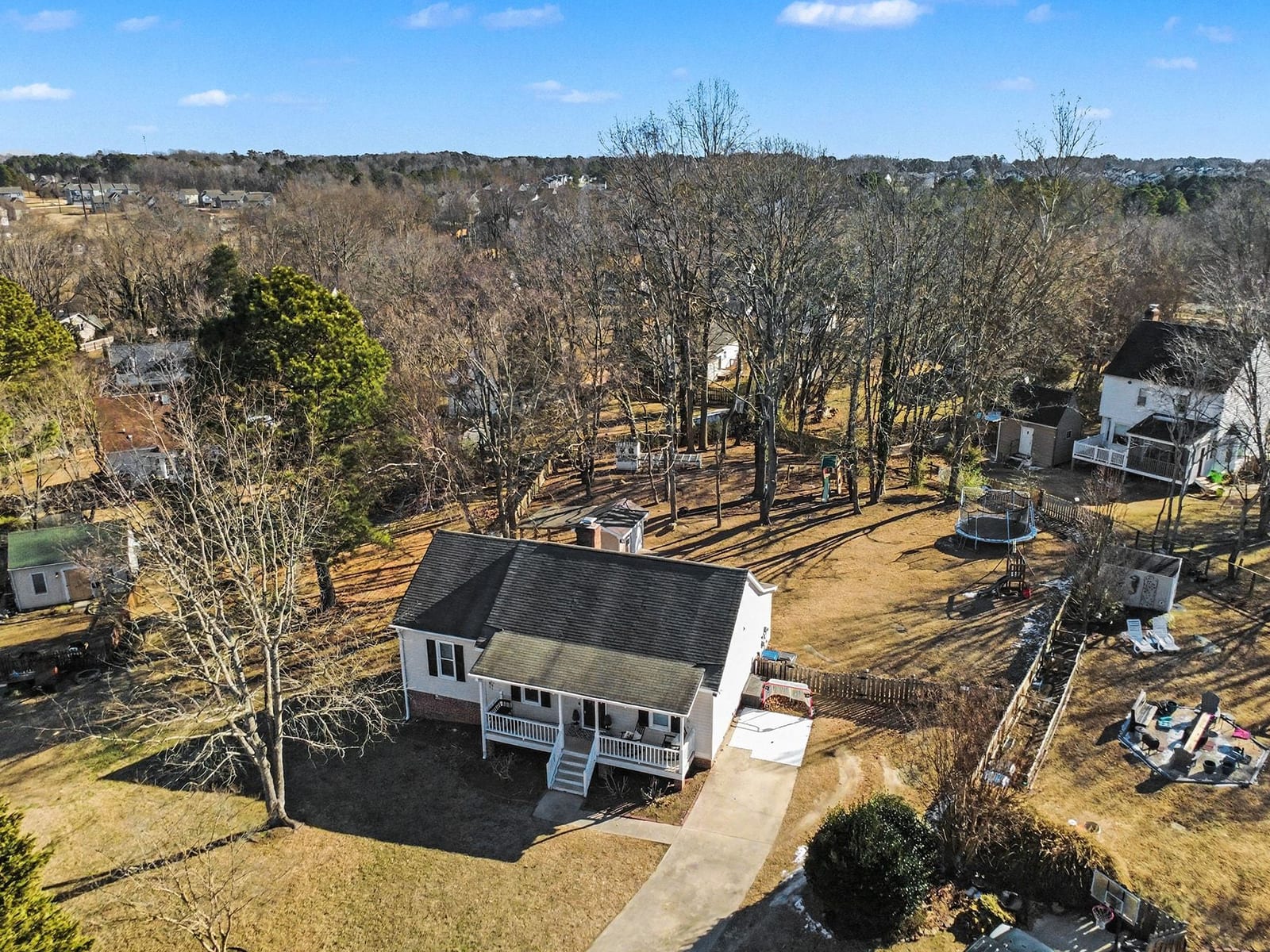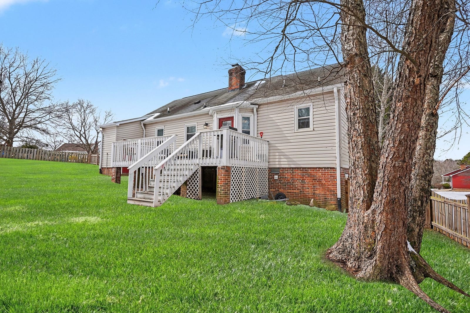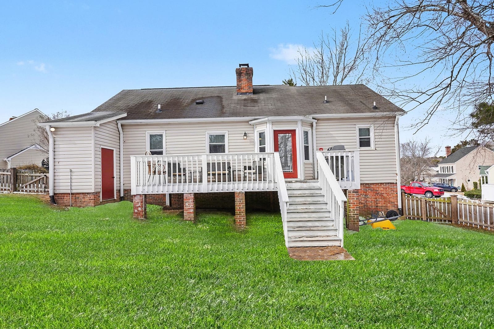 Rare combination of single-level living and a spacious, versatile lot this home is ideal for anyone seeking space and comfort. Situated on a cul-de-sac in the desirable Jones Dairy Farm community this 3 bedroom 2 bath home sits on .56 acres offering the kind of outdoor flexibility that's increasingly hard to find with an added bonus of no HOA dues. A large front porch welcomes you in, while the rear deck extends the living space outdoors for grilling, relaxing or enjoying the backyard views. The interior features hardwood floors throughout the living area with a wooded fireplace, open kitchen/dining area with stainless steel appliances and a large primary suite. Custom closet shelving, hardwood flooring in all bedrooms, ceiling fans and updated baths. The expansive lot is fenced in back and provides room for exterior storage, shed/workshop, play equipment, a chicken coup or whatever vision you have in mind!