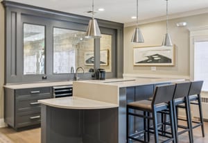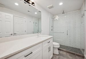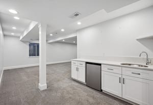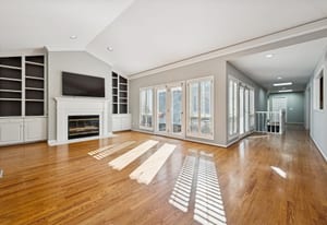 Architectural details include vaulted ceilings in the living room and primary bedroom, a fireplace, built-in bookcases, and wood flooring throughout the main living areas. The primary suite and an additional en suite bedroom offer flexible living arrangements, while a newly finished basement offers an additional bedroom, bathroom, bar, refrigerator, family room and storage area. A spacious two-car garage completes the home.