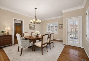 The main level features formal living and dining rooms alongside a comfortable family room adjacent to the kitchen, allowing for both everyday living and entertaining. Two private outdoor patios, including a walled courtyard and a fenced garden area, provide inviting spaces for seasonal gatherings and quiet moments outdoors.