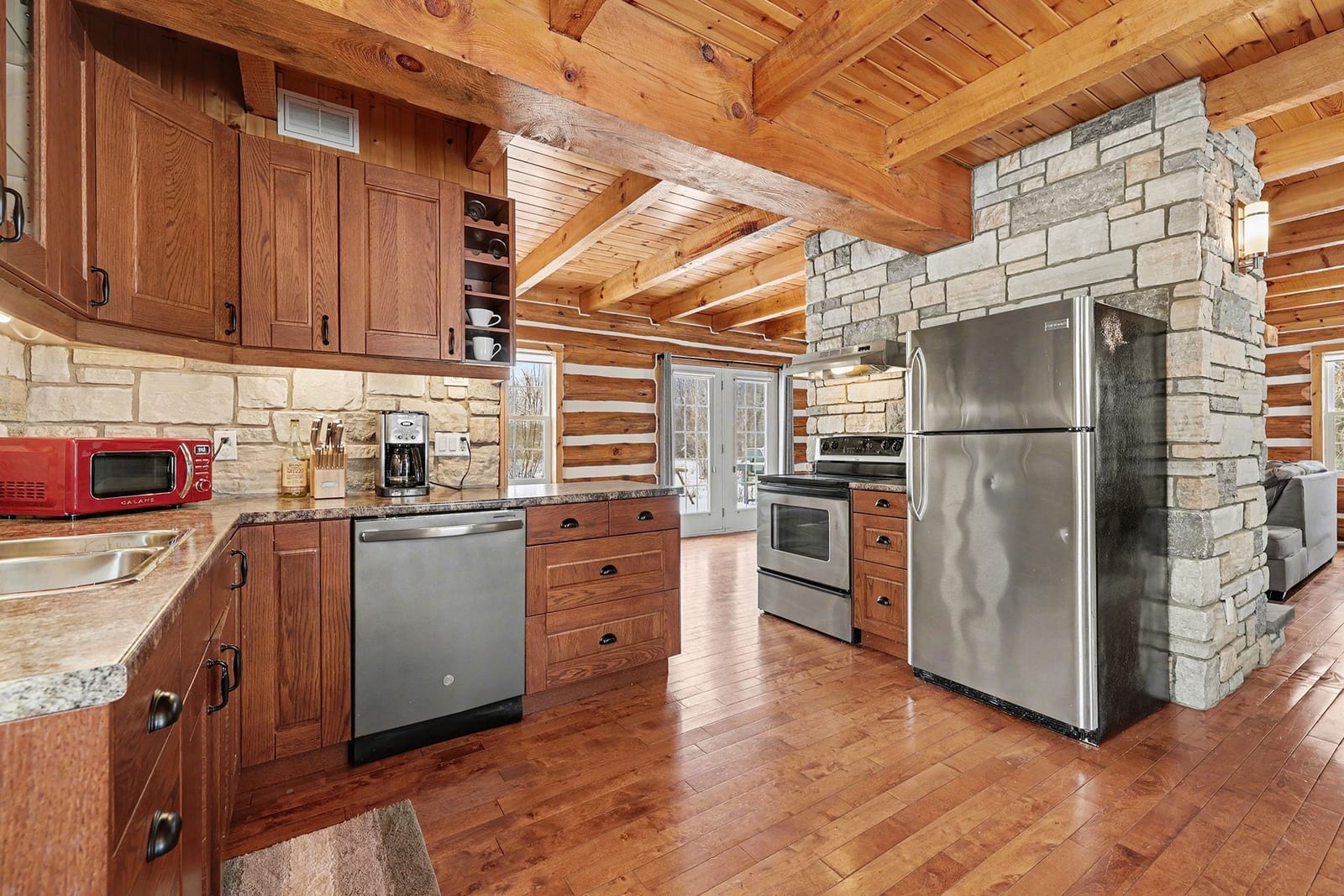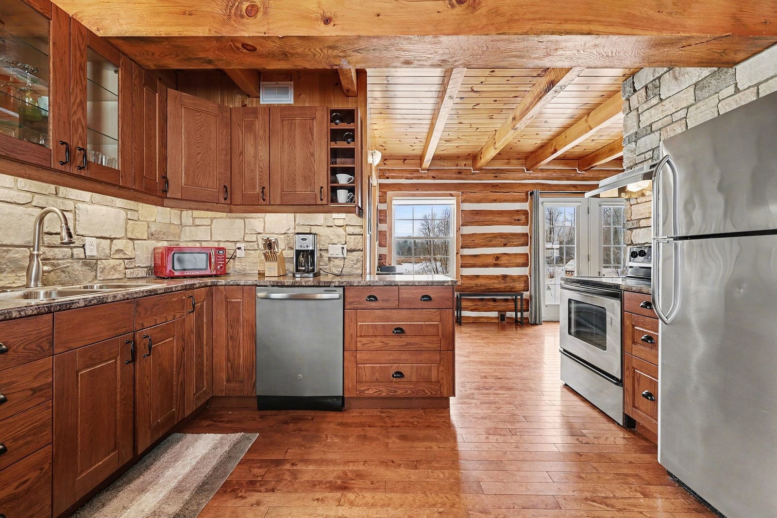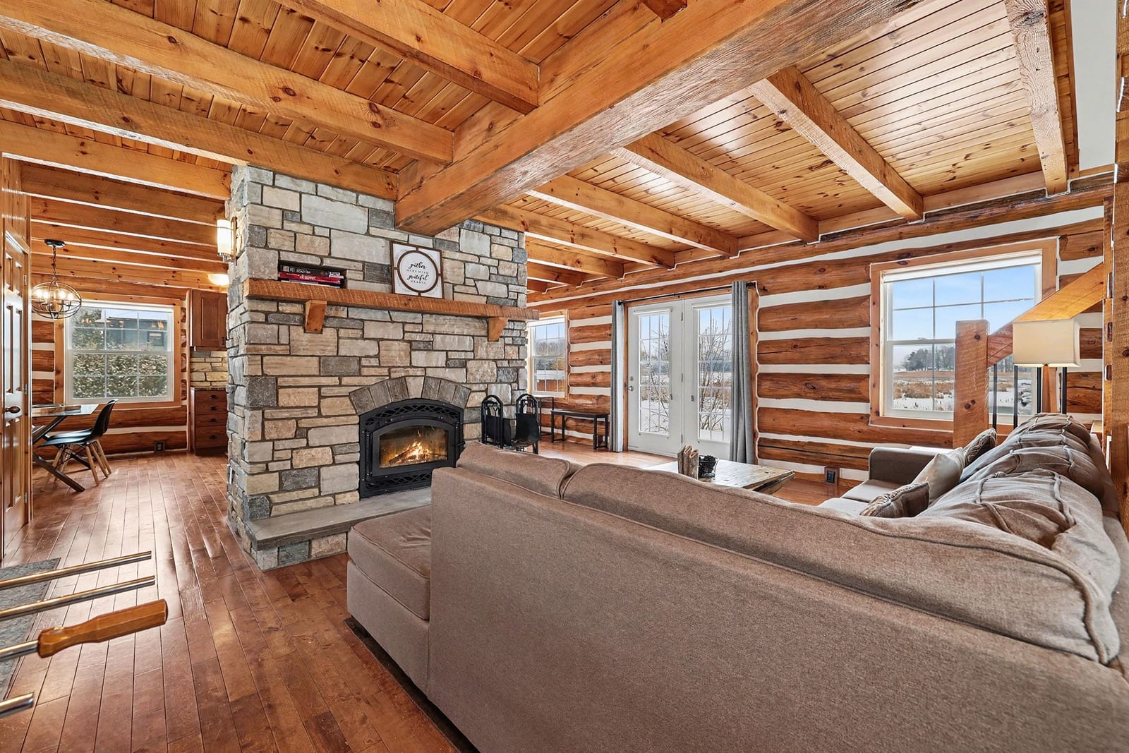 Experience waterfront living on Big Rideau Lake. This detached log home offers a rare blend of rustic elegance and turnkey comfort, providing the perfect retreat for those seeking relaxation, character, and unforgettable lakefront serenity. Featuring 3 bedrooms and 2 bathrooms, the home is offered fully furnished and thoughtfully equipped with everything needed to embrace the lake lifestyle - from outdoor entertaining furniture and BBQs to kayaks ready for your next adventure on the water. Inside, the main floor is both warm & welcoming, with a bright eat-in kitchen, convenient main floor laundry + 2 piece bathroom, an open living room anchored by a magnificent stone fireplace - a true statement piece & gathering area. Patio doors lead seamlessly to a beautiful stone patio, ideal for grilling dinner, or peaceful mornings overlooking the lake. Don't miss the pergola offering shade & an outdoor dining space. The second level has an additional sitting area or den at the top of the stairs - a perfect space for quiet relaxation & reading plus 3 lovely bedrooms (two of them have amazing views down the lake). Enjoy the ease of year-round access on a paved municipal road, complete garbage & recycling pick-up right at the door - a rare convenience! Perfectly situated just 12 minutes to the charm of Heritage Perth, with a boat launch just down the road and the Rideau Ferry Store and restaurant only a short drive - or scenic boat ride - away. Whether you're cruising the lake from your dock or paddling along the shoreline, this is a wonderful setting to truly enjoy the best of life on Big Rideau Lake.