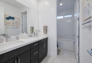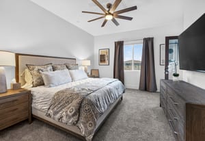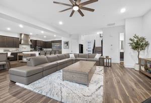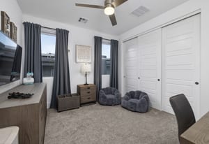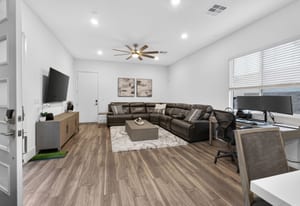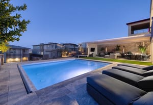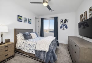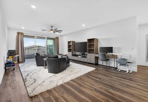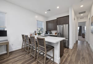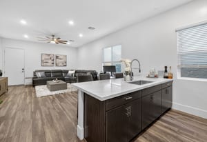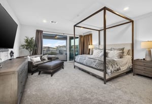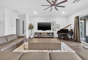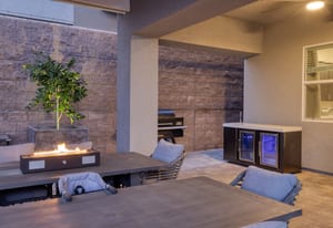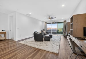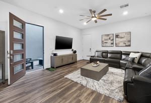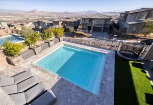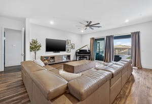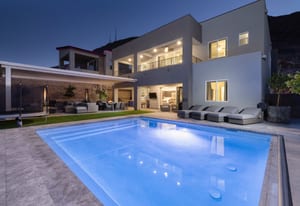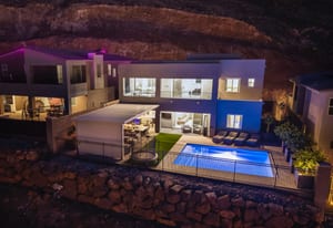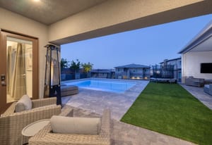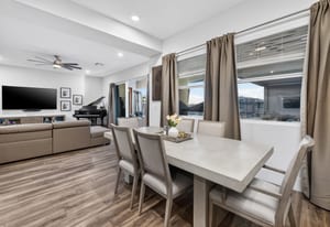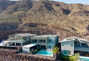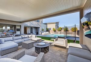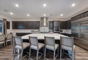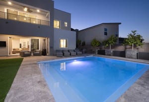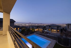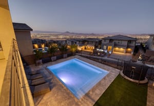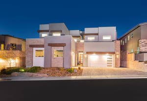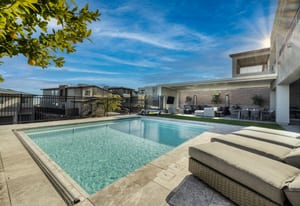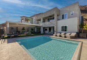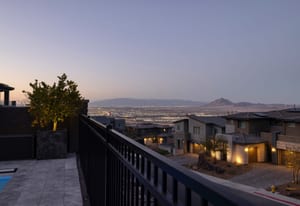 Nestled within a private cul-de-sac in the prestigious gated community of Tresor, this contemporary five-bedroom, five-bath residence is set on an elevated lot showcasing unobstructed mountain and valley views. The thoughtfully designed layout includes a highly desirable Next-Gen suite on the main level with a private entrance, living area, kitchenette, and laundry—perfect for guests or extended family. The primary suite serves as a serene retreat with a private deck and a spa-inspired bath featuring dual vanities, a soaking tub, and an expansive walk-in shower. At the heart of the home, the chef’s kitchen is highlighted by a dramatic waterfall-edge island, quartz countertops, custom cabinetry, and GE Monogram appliances, opening seamlessly to the main living and dining spaces for effortless entertaining. Outdoor living is enhanced by a resort-style pool with automatic cover, a generous covered patio, and breathtaking desert sunsets, creating an ideal setting for relaxed luxury living.