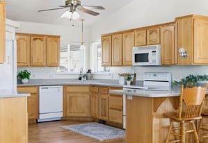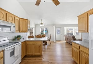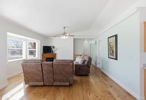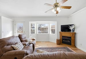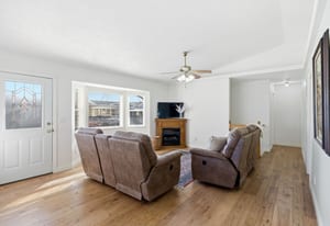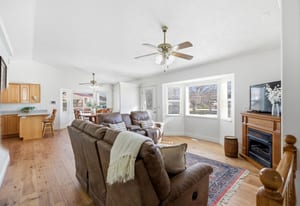 Set on a fully landscaped corner lot in the 55+ King Row Estates community, this 2 bedroom, 2 bathroom home offers 2 living spaces, 2 outdoor living spaces with a thoughtful layout and bonus basement. Features include 32" wide doorways, a ramped walkway from the covered parking to the front door and a roll-in shower. The main living area includes an open floor concept, bay box windows, blinds, a gas fireplace, large laundry room with built-in cabinets and countertop, plenty of storage, and the spacious kitchen is equipped with Corian countertops, attached large overhang, and a reverse osmosis water system. The finished basement provides a second living room that works well for guests, hobbies, or everyday use. Additional features include a storage shed, covered parking for two vehicles, extra storage in the basement, and an alarm system. Yard maintenance is included, making daily upkeep easy. King Row Estates offers community amenities including a clubhouse, swimming pool, hot tub, and workshop in a convenient Washington location.