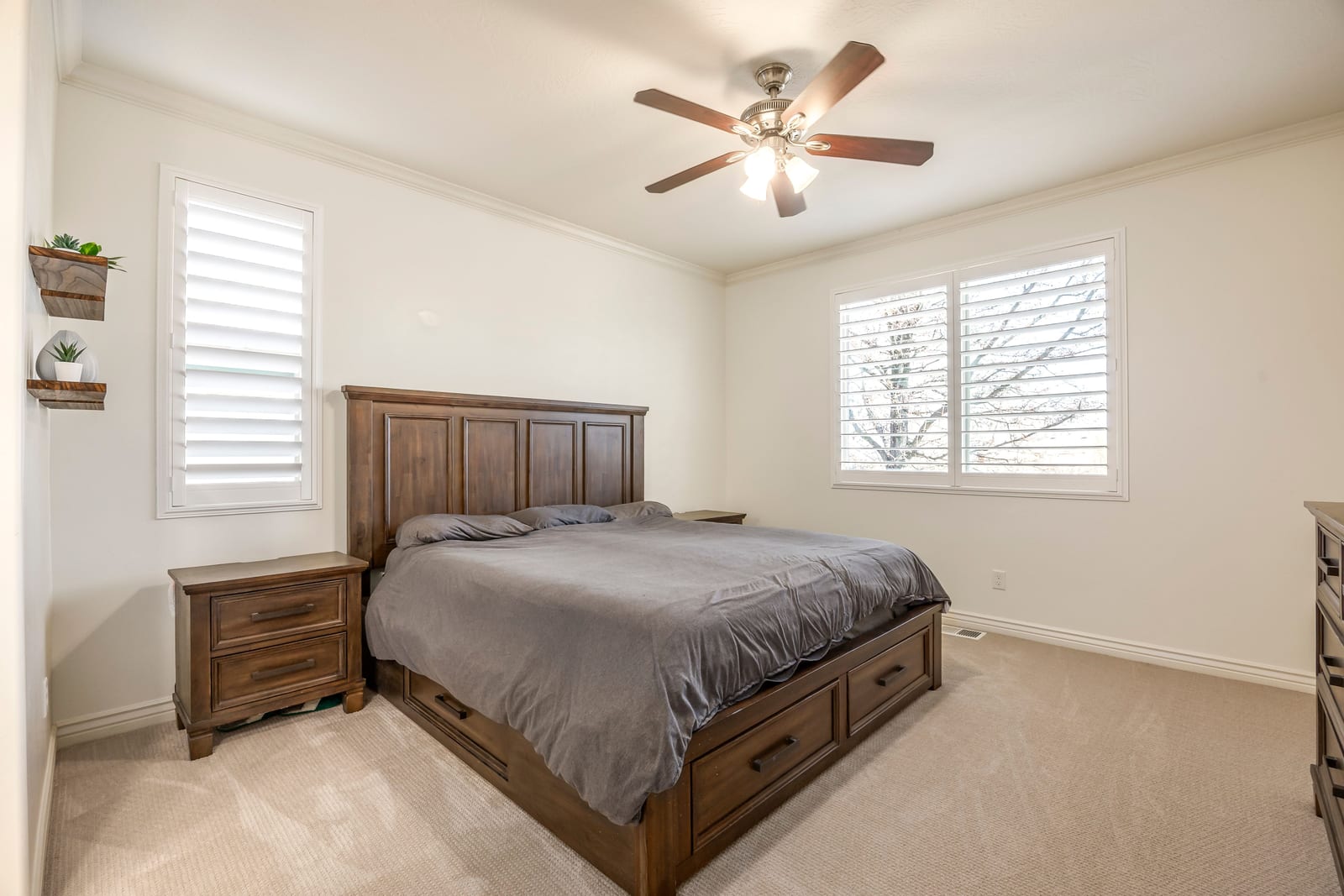 Located inside the gates of Heatherwood Village in South Jordan, this beautifully maintained rambler offers true single level living with vaulted ceilings, consistent 9 foot ceilings including the basement, and great natural light throughout. With 5 bedrooms, 3 bathrooms, and 3,248 square feet, the home features brand new carpet, plantation shutters, a water softener installed in 2021, Tesla charger, and a brand new HVAC system in 2025.