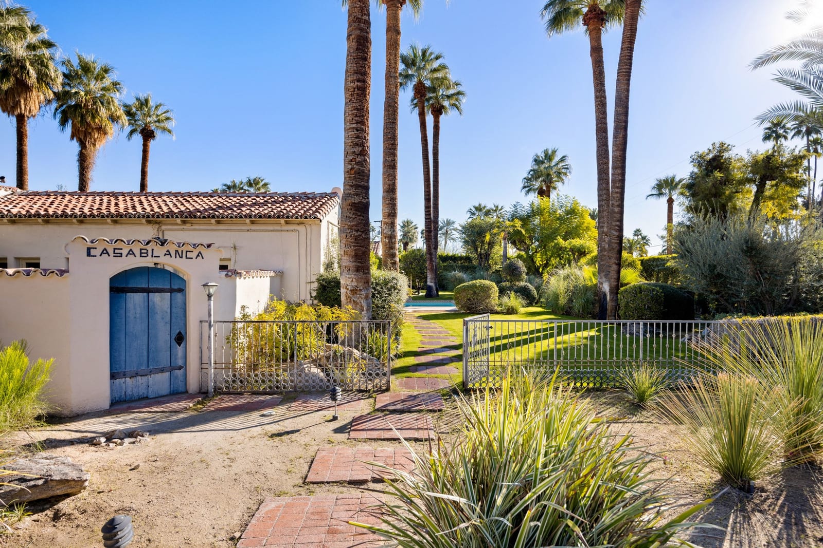 Introducing Casablanca, an iconic California Spanish architectural estate is a rare and soulful compound set behind a private gate in the heart of Historic Old Las Palmas. Long held by the Warner family, the property reflects the quiet gravitas of its original steward, Jack Warner, legendary co-founder of Warner Bros. and one of the architects of Hollywood's Golden Age. His legacy of storytelling, elegance, and permanence lives on here. Sited on expansive, beautifully landscaped grounds, the residence unfolds as a true desert compound. Once through the gate it reveals a residence that has retained its integrity, charm, and authenticity over decades. Classic proportions and a natural indoor-outdoor flow speak to a purity rarely preserved at this scale. Outdoor living defines the experience. A large pool and surrounding gathering areas create an effortless entertaining environment, while a rooftop deck offers sweeping views across the estate grounds to dramatic mountain backdrops. Whether hosting an intimate get-together or a larger celebration, the setting has captures the essence of Palm Springs living for decades. Current solar power system is owned, the grounds are generous and mature, and the atmosphere is one of quiet confidence rather than spectacle. If walls could talk, Casablanca would tell stories of Hollywood royalty, creative legacy, and a time when homes were built to endure. This is an exclusive a once-in-a-lifetime opportunity to steward a true Palm Springs landmark.