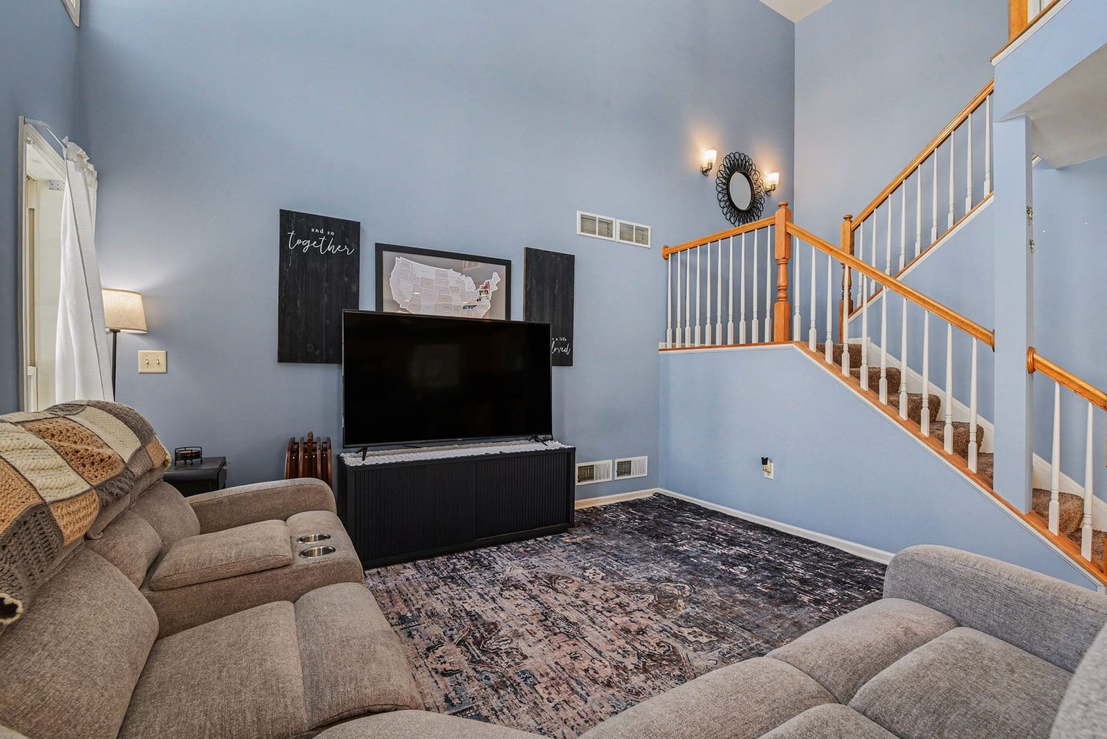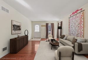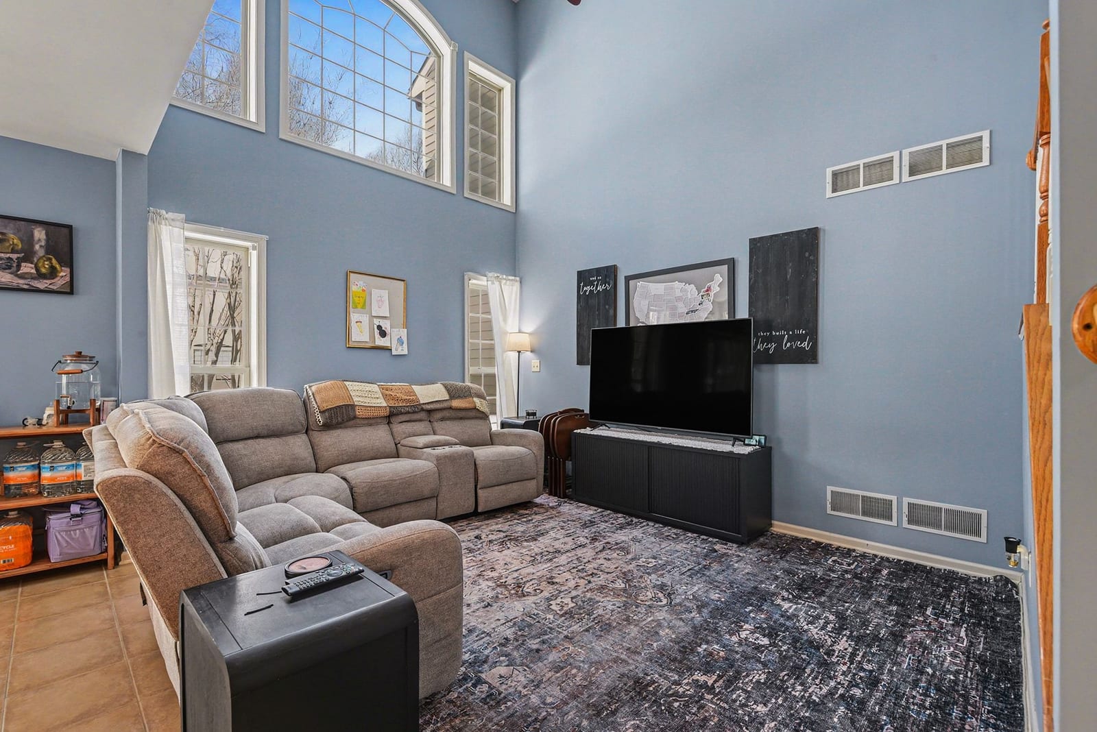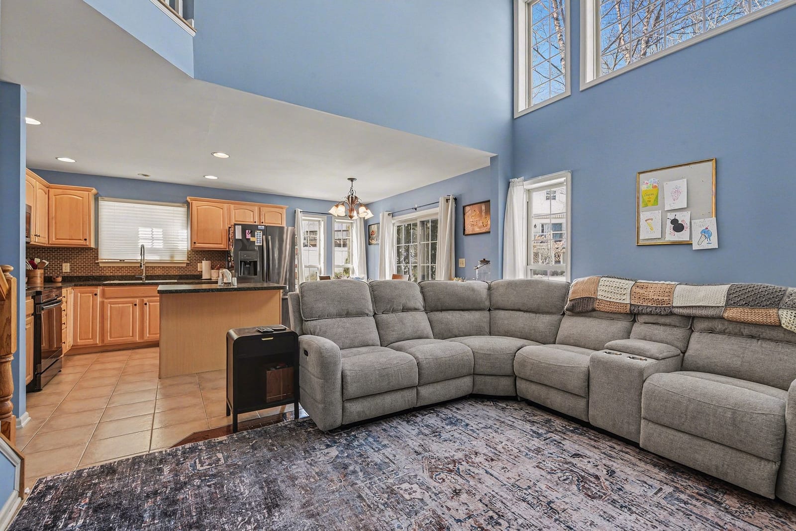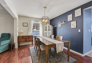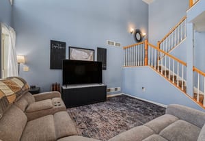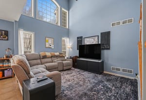 Step inside and the first thing you’ll notice is the light. The two-story living room and oversized palladium window make the whole space feel open, bright, and welcoming. Hardwood floors carry through the entry and into a flexible space that can be whatever you need it to be right now, a home office, playroom, reading room, or second living area.