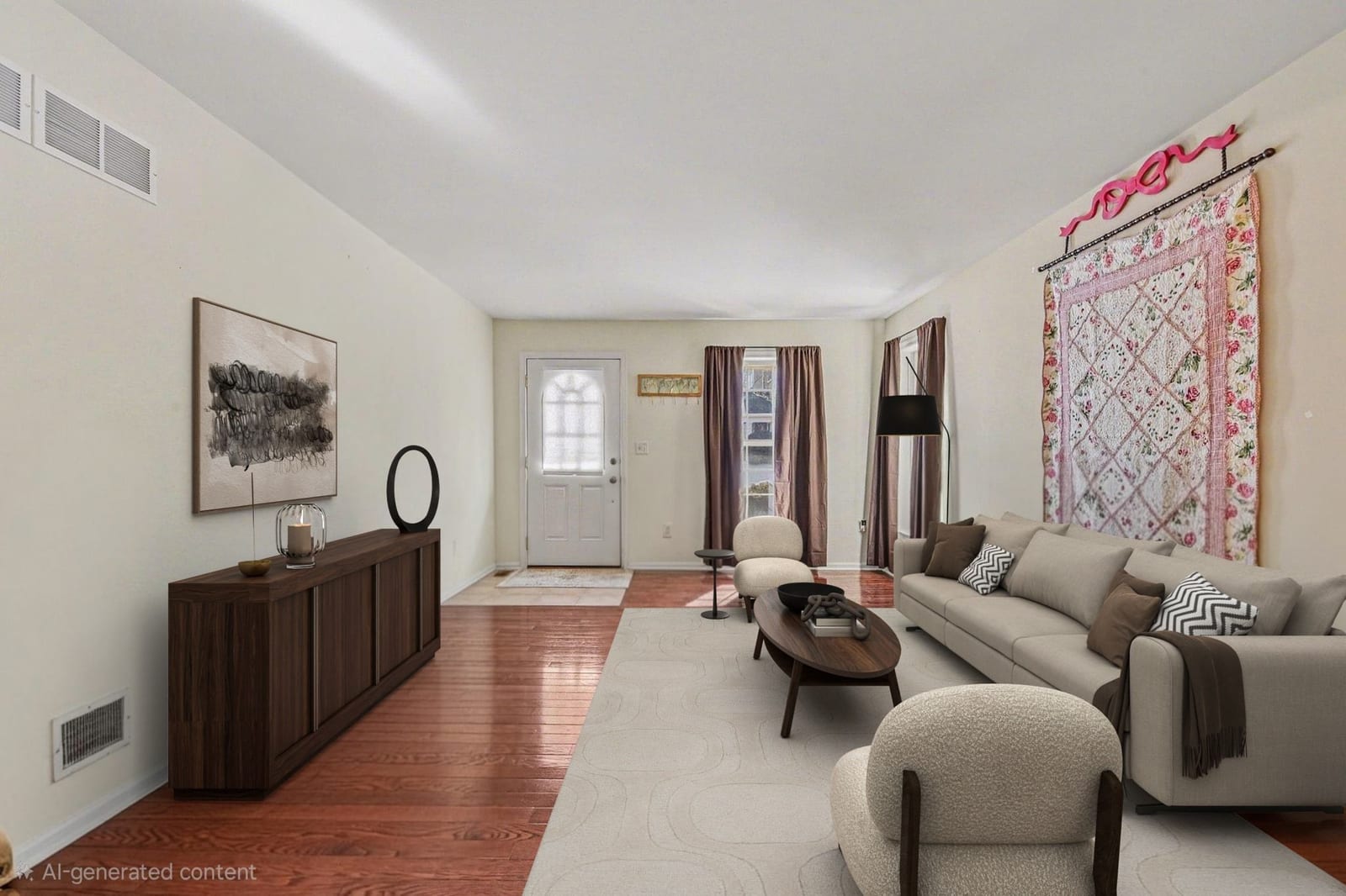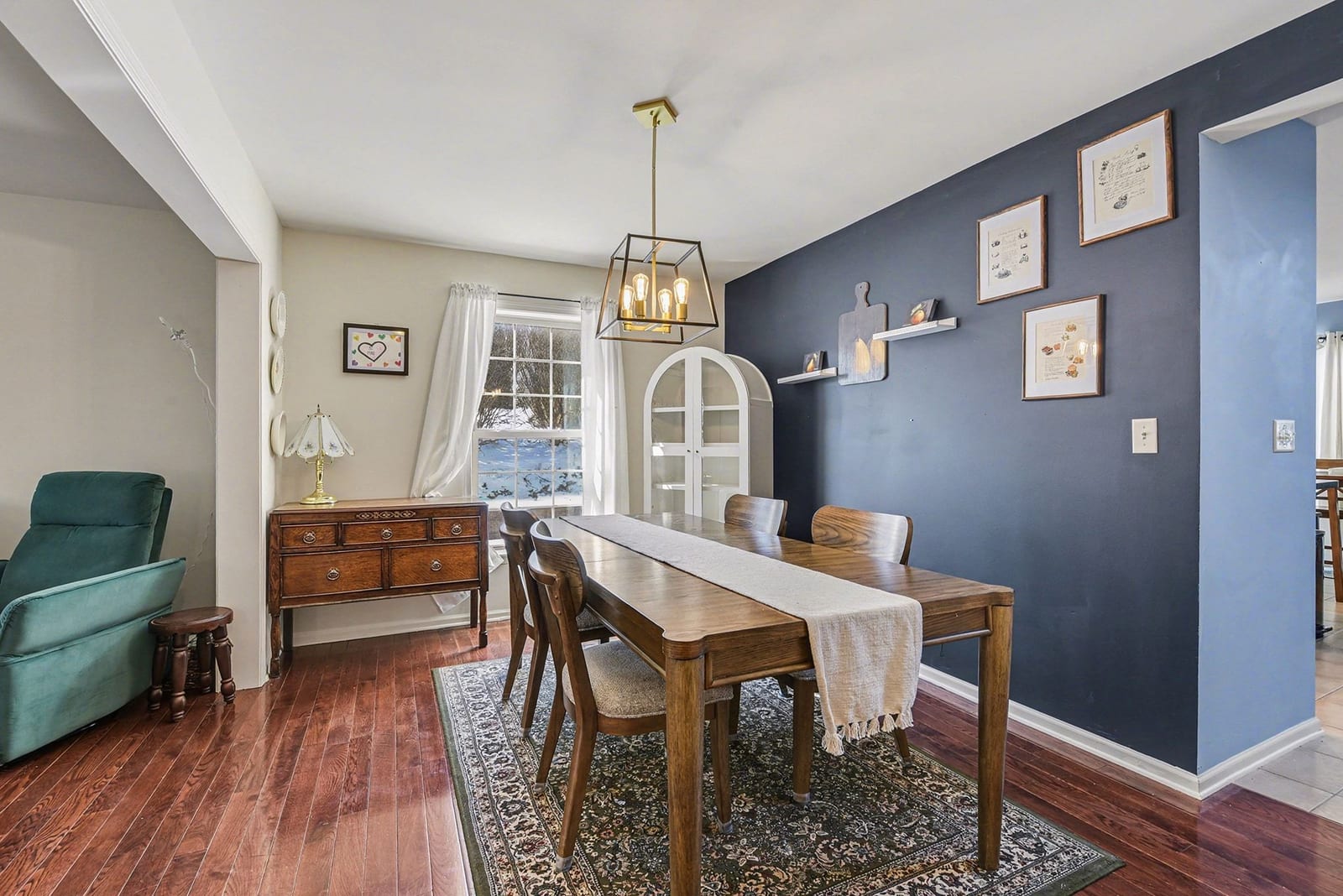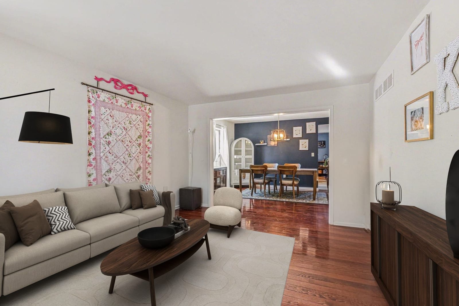 Step inside and the first thing you’ll notice is the light. The two-story living room and oversized palladium window make the whole space feel open, bright, and welcoming. Hardwood floors carry through the entry and into a flexible space that can be whatever you need it to be right now, a home office, playroom, reading room, or second living area.