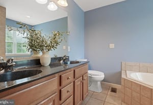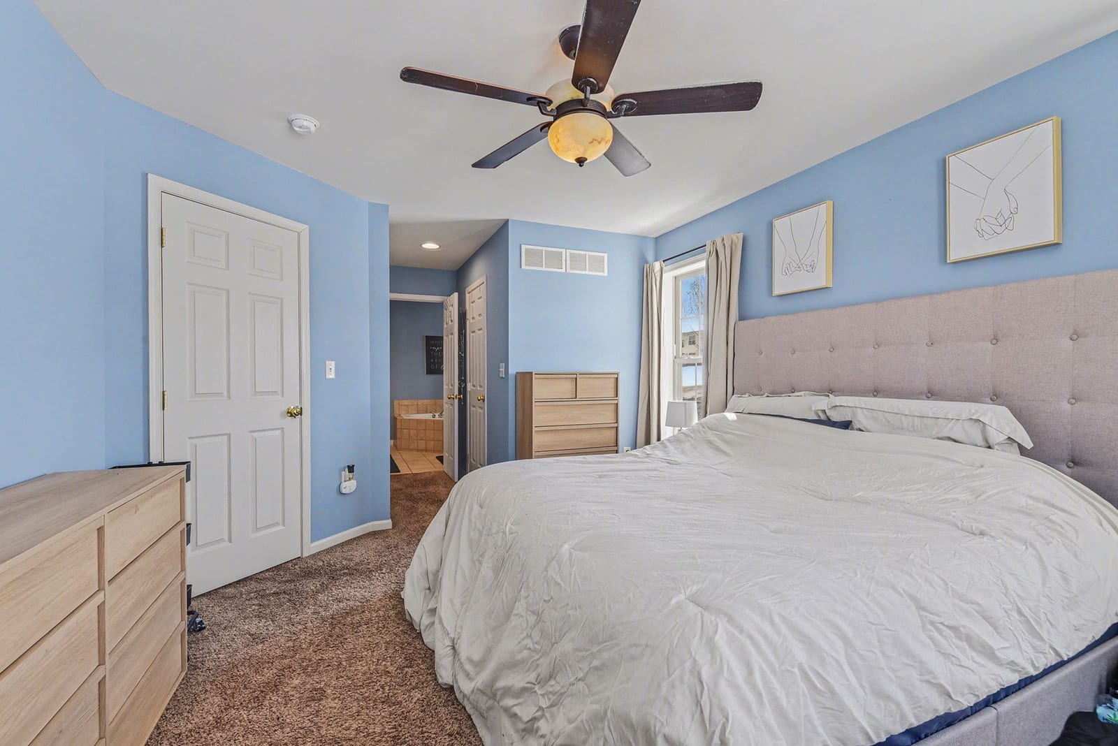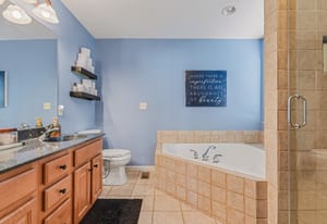 Upstairs, the primary suite sits quietly at the back of the home, creating a peaceful retreat. Two closets, including a walk-in, offer plenty of storage, and the private bath features a double vanity, soaking tub, and tiled glass-door...
