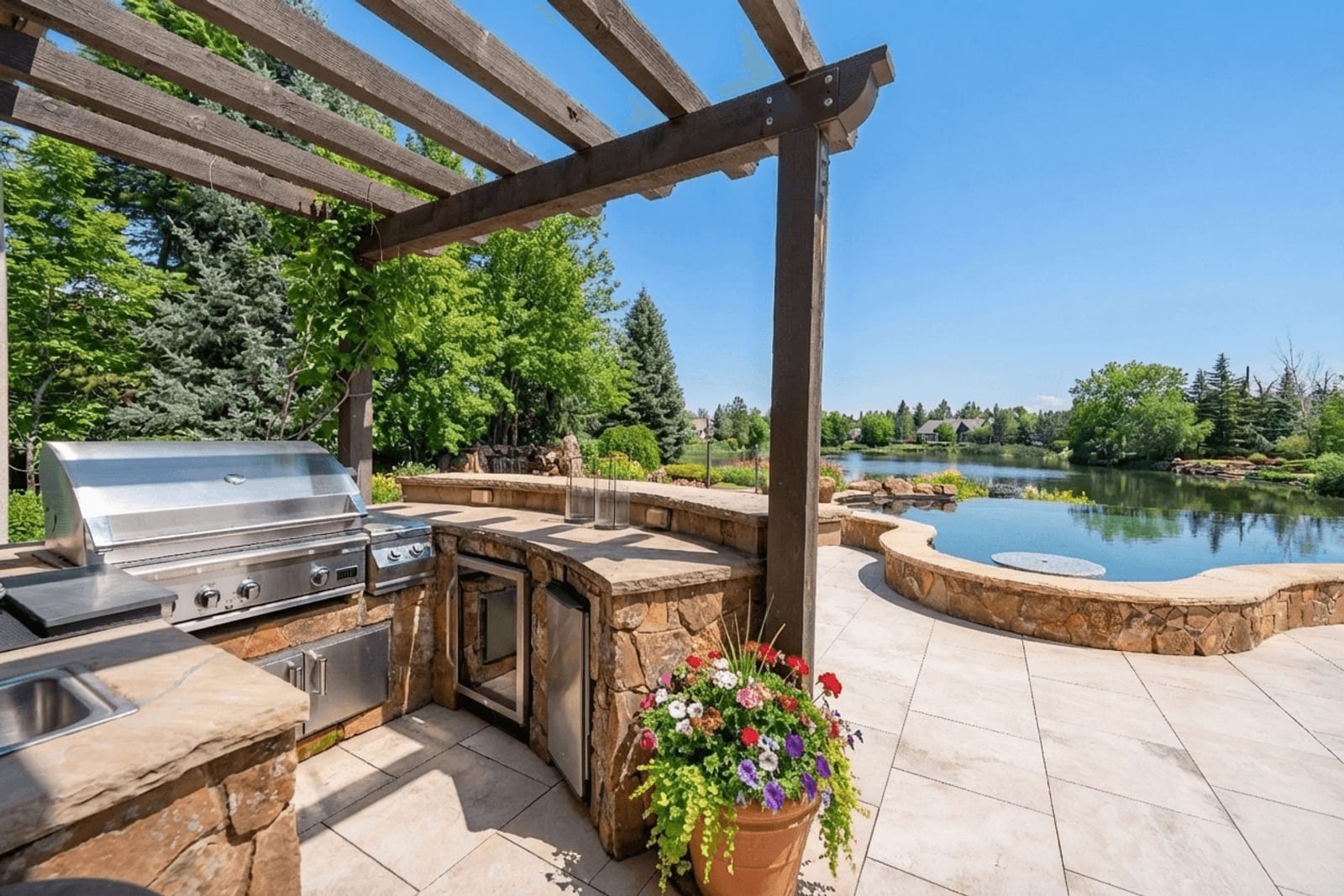 Outdoors, the estate unfolds like a private resort. A renovated infinity-edge pool appears to merge with the pond beyond, complemented by a waterfall, spa, expansive porcelain terraces, outdoor kitchen, fire feature, and rare white sand beach. The setting offers both serenity and spectacle—hallmarks of waterfront living in Eagle.