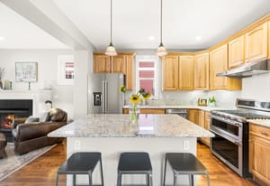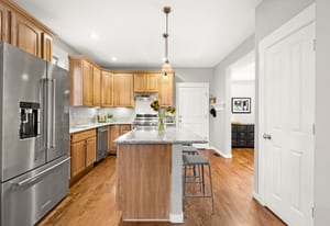 Inside, a dramatic 24-foot entry and oak hardwood floors create an immediate sense of warmth and scale. The living room with gas fireplace flows seamlessly into the updated kitchen featuring granite countertops, a center island, and new stainless-steel appliances. The dining area opens to a private southwest-facing backyard, filling the home with natural light. A powder bath completes the main living space.