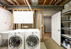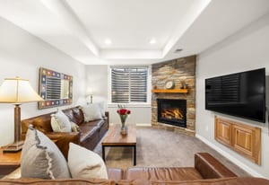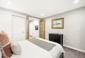 The finished basement expands the living space with a large rec room, second gas fireplace, recessed lighting, and a wet bar with tile countertops, cabinetry, and mini refrigerator—ideal for entertaining. An additional bedroom, three-quarter bath, and spacious utility/laundry room complete the lower level.