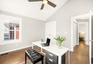 Upstairs are three well-sized bedrooms with ceiling fans and a full bath with double vanities and skylight. One bedroom is currently used as an office and could easily be enclosed for privacy.
