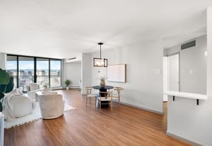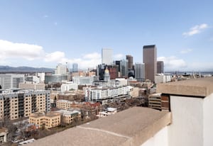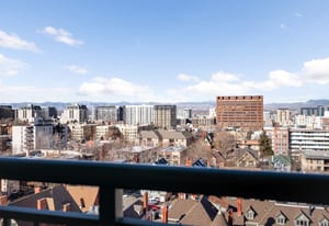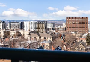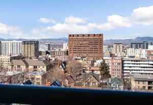 Expansive mountain and downtown Denver views take center stage in this beautifully updated, western facing condo. Experience BREATHTAKING views from every window, including oversized sliding balcony doors and bay bedroom windows. Located in the sought-after Penn Square building in the heart of Capitol Hill, this light-filled one bedroom offers flexible living, dining, and workspace.
