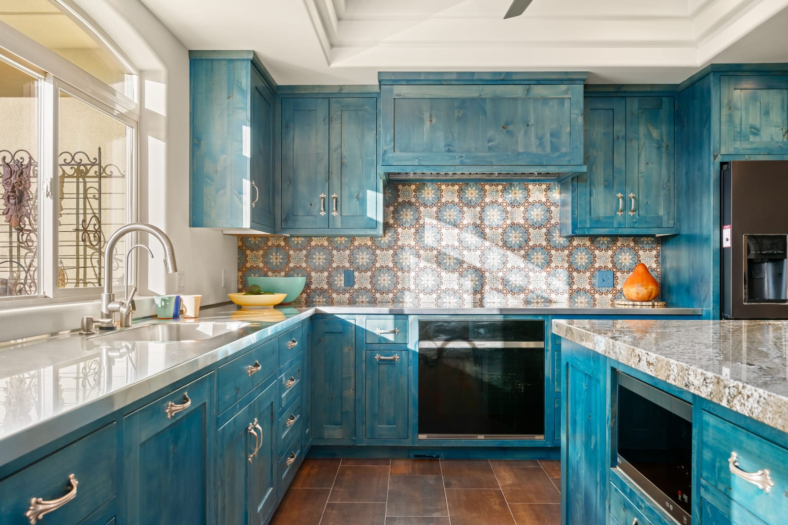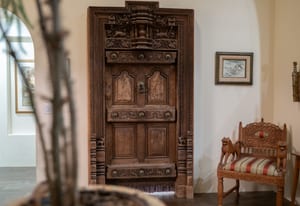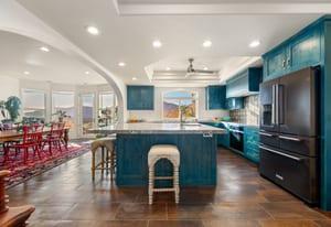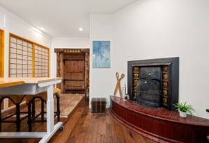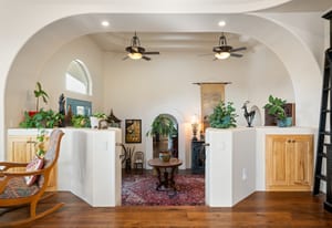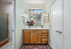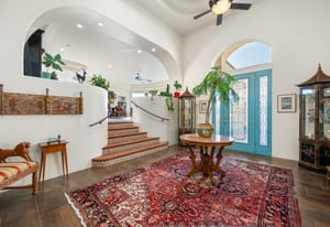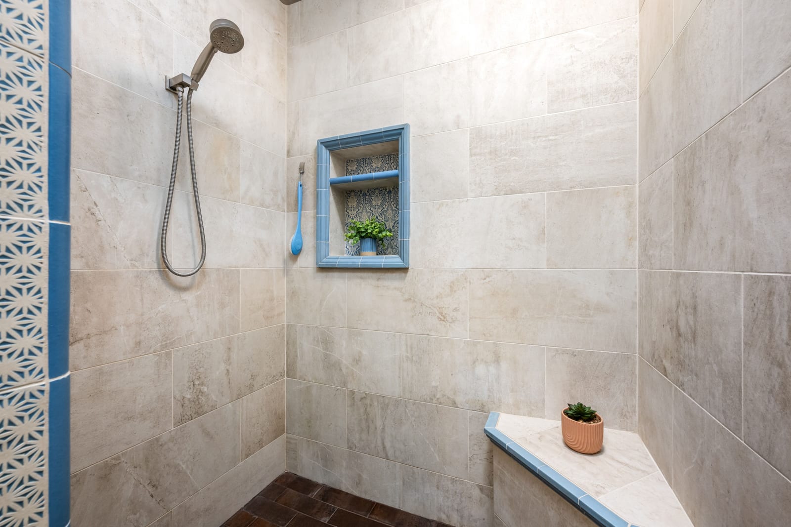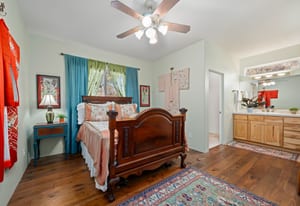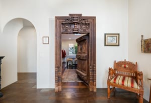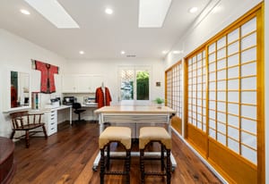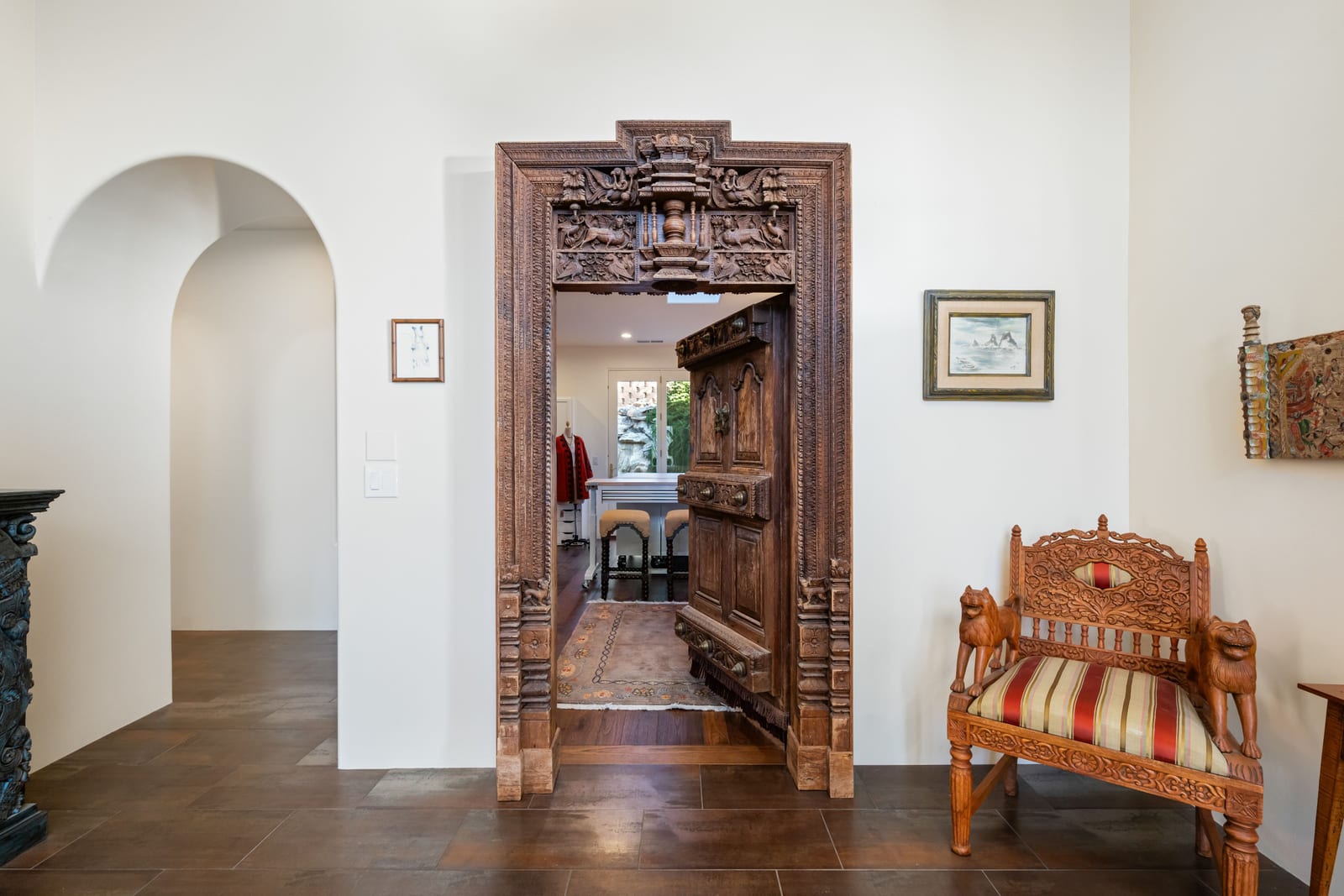 The main residence offers a desirable split-bedroom layout with a spacious primary suite featuring two walk-in closets (one with built-in safe) and a custom bath with dual sinks and walk-in shower. Two additional bedrooms each offer nearby or private 3/4 baths. Major 2017 updates include an enclosed back porch with Indian Temple Door, Art Nouveau fireplace, remodeled kitchen and primary bath featuring custom hand made ceramic tile, new flooring throughout.