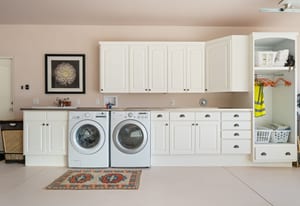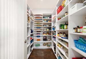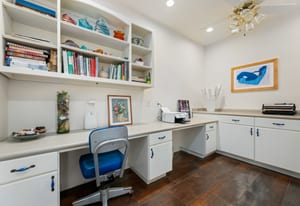 The gourmet kitchen features a large solid granite island, stainless steel countertops, built-in Wolf induction cooktop and oven, touch-activated sinks, integrated-panel dishwasher, walk-in pantry, and a flexible office/butler’s pantry/laundry space. The home connects to an attached 2-car garage with utility sink and laundry hookups.