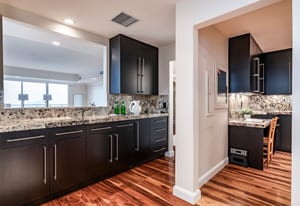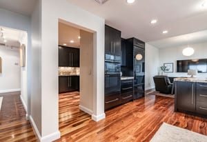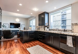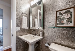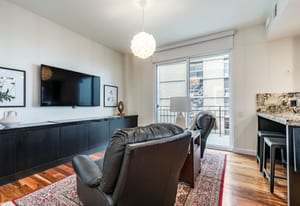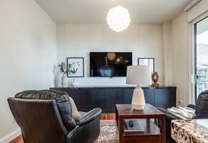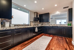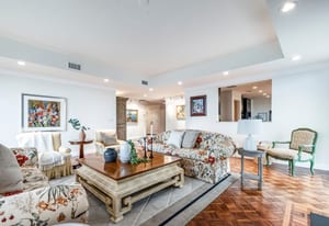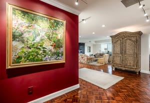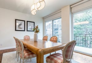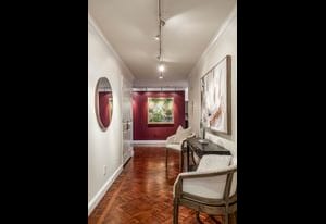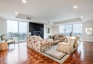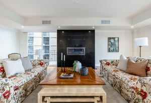 Professionally renovated with a designer’s eye and meticulous attention to detail, the home boasts parquet hardwood floors and soaring nine foot ceilings that create an immediate sense of warmth and sophistication upon entry. Thoughtfully integrated LED lighting and a custom gas fireplace with a granite mantel that extends to the ceiling anchor the main living area in modern elegance.