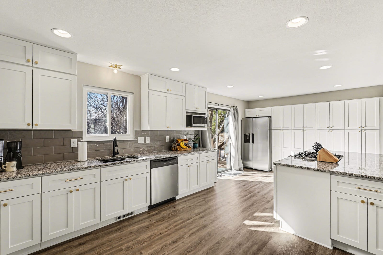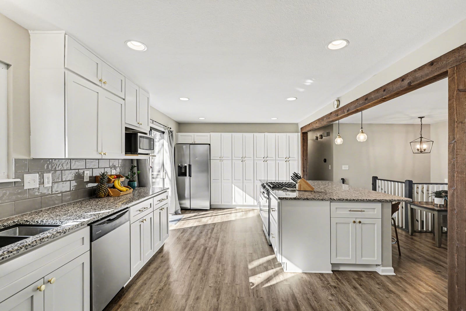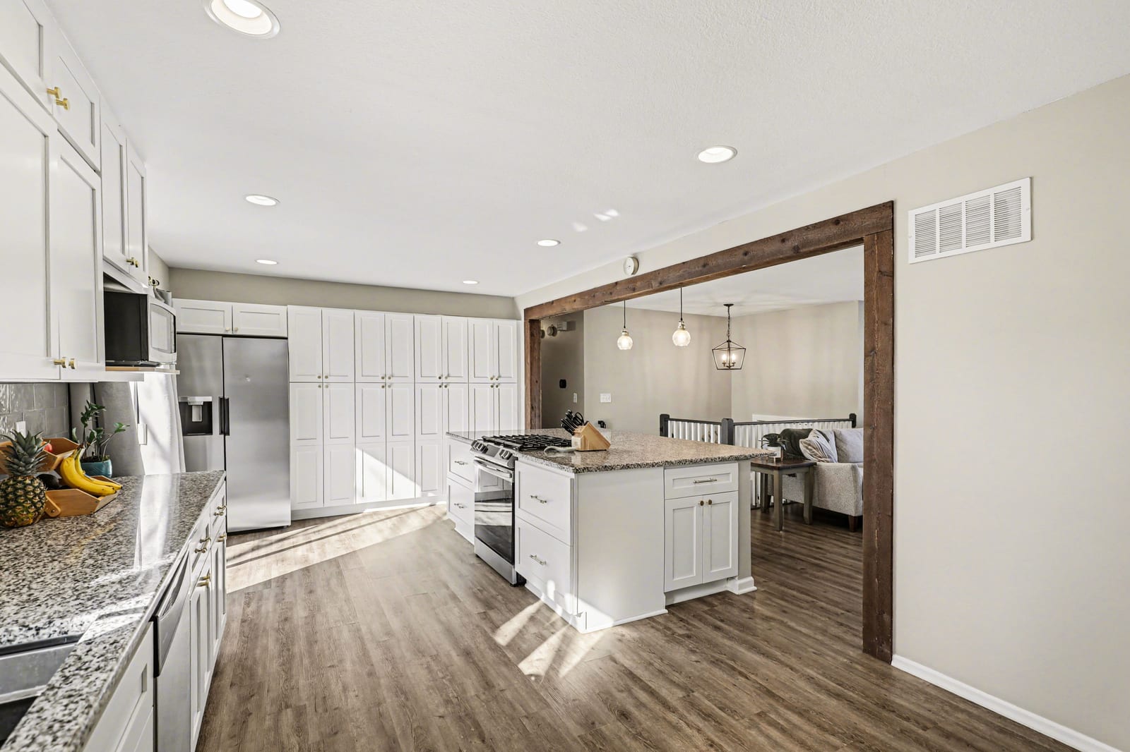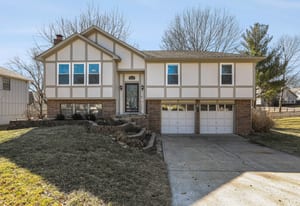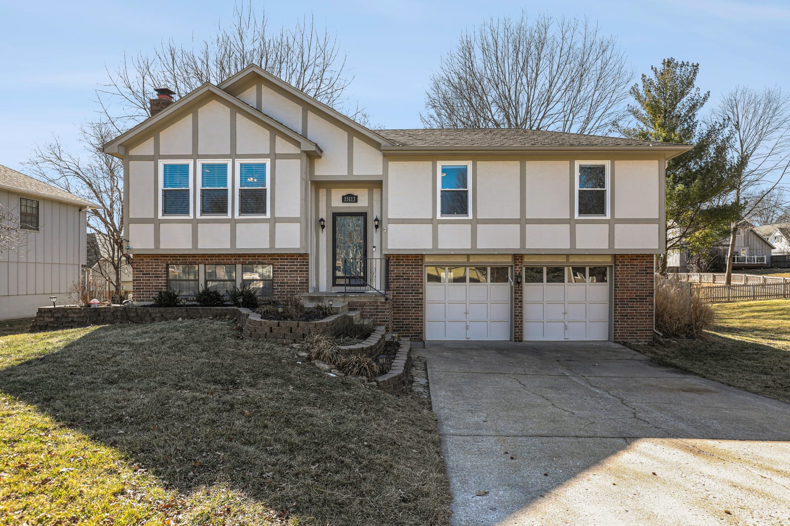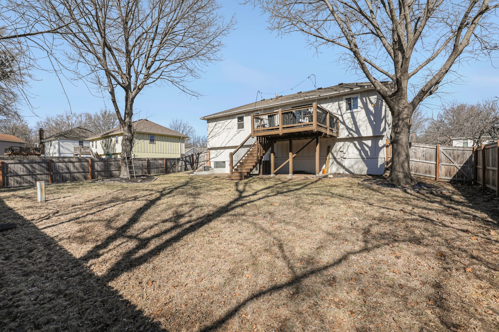 Updated move in ready sassy split with lots new! So much to love about this sassy split with Open Airy floor plan. Kitchen with HUGE quartz island has bright white cabinets galore including a full wall pantry! Newer stainless appliances too! 3 bedrooms, 3 full baths, and nearly 1800 sq ft of beautifully maintained living space—plus a newly renovated rec room and full bath in finished lower level. New carpet and vinyl plank flooring throughout. The soaring ceilings in the family room highlight the fireplace and nicely done kitchen and dining area which offers easy access to the deck. Large primary suite with updated onsuite bath. Two secondary bedrooms one with new carpet and the other with vinyl plank have easy access to updated center hall second full bath. Enjoy outdoor living on the deck and patio overlooking the fenced yard. You won't want to miss this wonderful home in Lenexa! Conveniently located to shopping, restaurants and schools. Treat Yourself!
