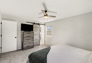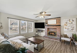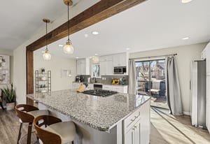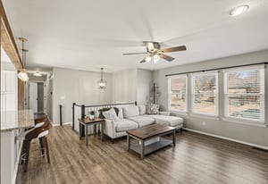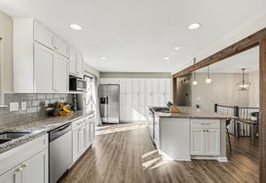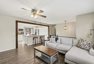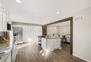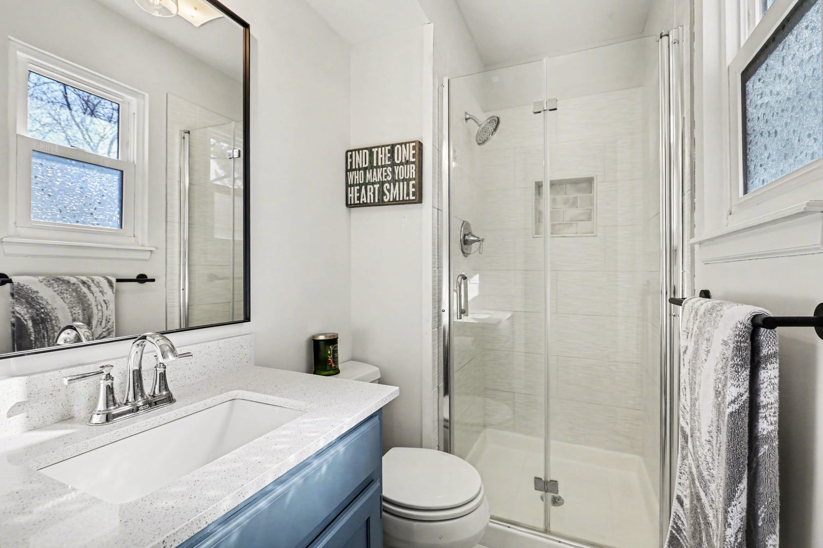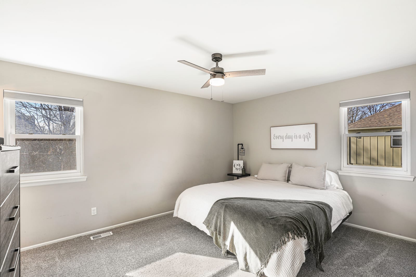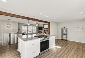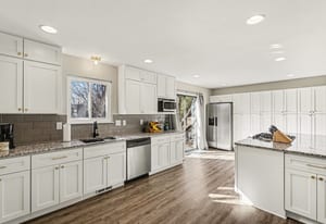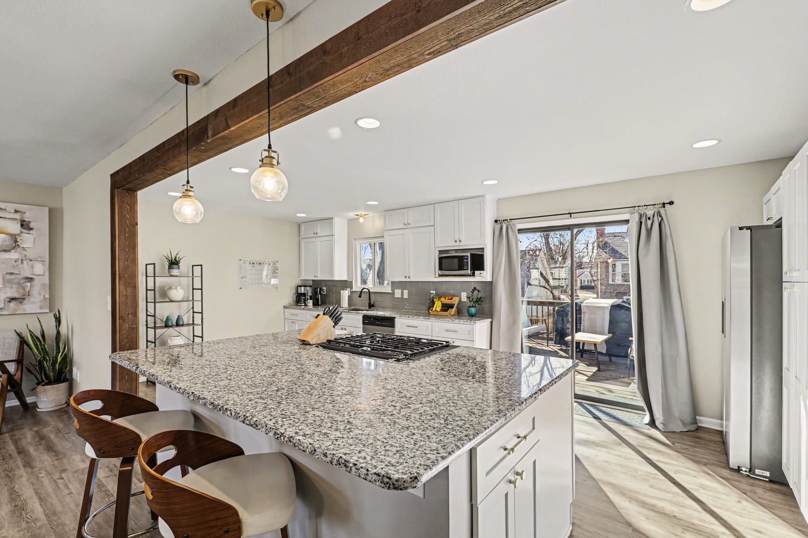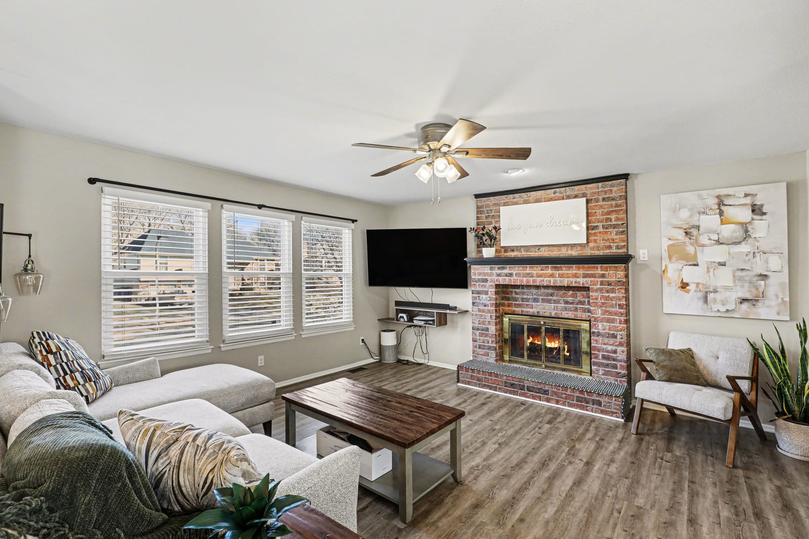 Updated move in ready sassy split with lots new! So much to love about this sassy split with Open Airy floor plan. Kitchen with HUGE quartz island has bright white cabinets galore including a full wall pantry! Newer stainless appliances too! 3 bedrooms, 3 full baths, and nearly 1800 sq ft of beautifully maintained living space—plus a newly renovated rec room and full bath in finished lower level. New carpet and vinyl plank flooring throughout. The soaring ceilings in the family room highlight the fireplace and nicely done kitchen and dining area which offers easy access to the deck. Large primary suite with updated onsuite bath. Two secondary bedrooms one with new carpet and the other with vinyl plank have easy access to updated center hall second full bath. Enjoy outdoor living on the deck and patio overlooking the fenced yard. You won't want to miss this wonderful home in Lenexa! Conveniently located to shopping, restaurants and schools. Treat Yourself!
