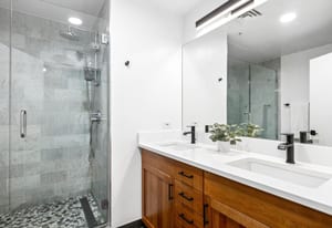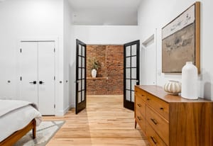 French doors open to a serene primary suite complete with a walk-in closet, an additional closet, and a spa-like bath featuring dual sinks and an expansive glass shower. A private guest bathroom with a steam shower complements the built-in Murphy bed, offering refined flexibility for hosting. In unit laundry and hardwood floors throughout reinforce both convenience and timeless craftsmanship.
