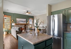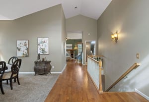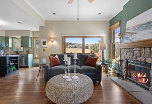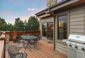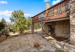 Tall, vaulted ceilings and Andersen windows on the main level invite natural light and frame views of towering pines, the fairway, and the pond beyond, often dotted with ducks and geese. Embracing classic Colorado charm with beautiful wood floors, the great room’s fireplace anchors a warm gathering space, while the kitchen opens seamlessly to a redwood deck with electric awning, ideal for morning coffee, summer dinners, or quiet wildlife sightings at dusk.