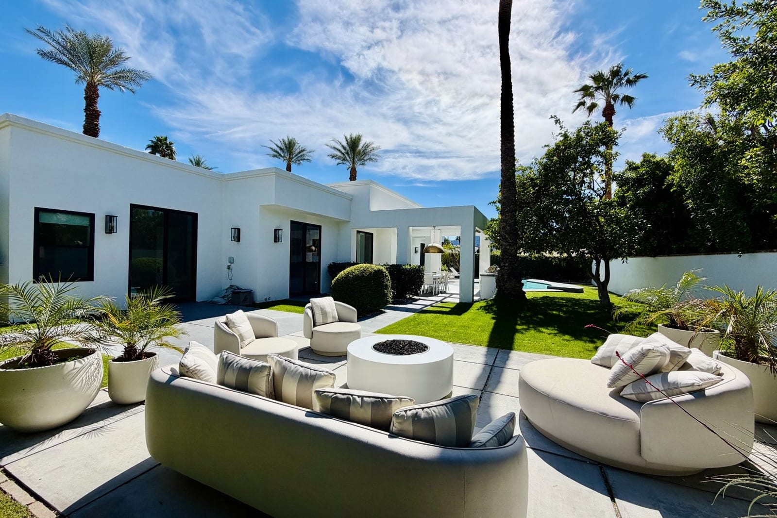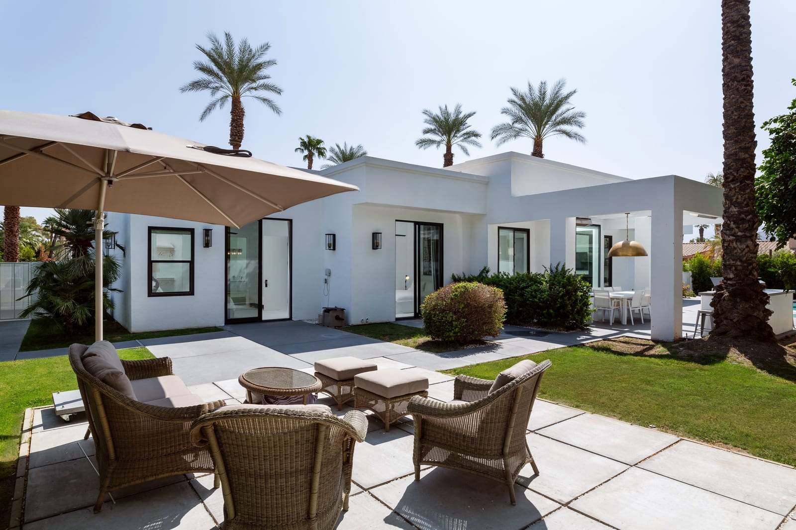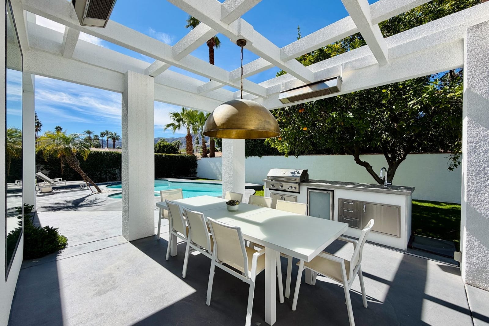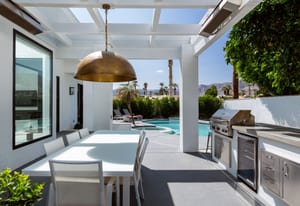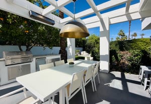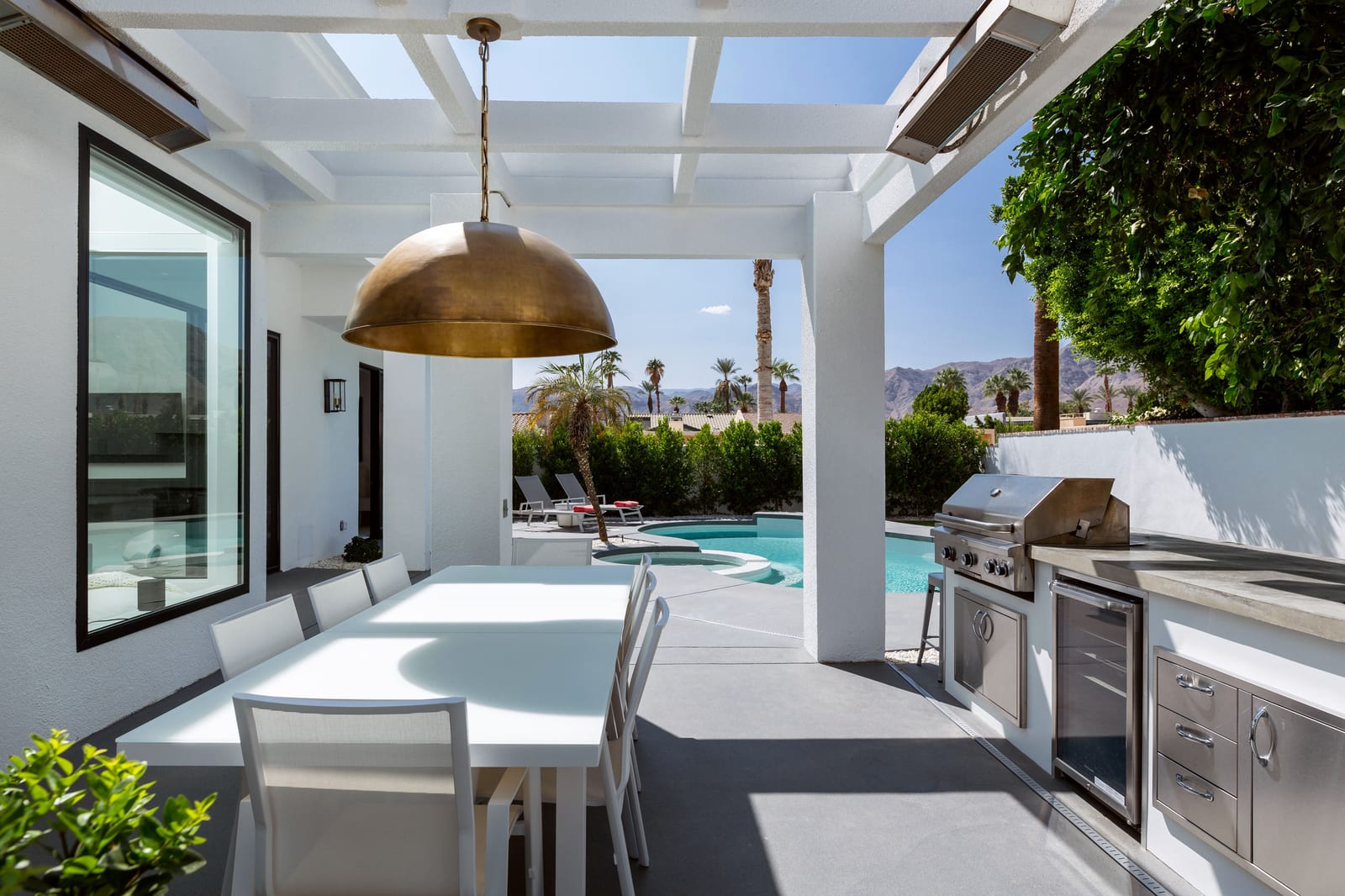 Outdoors, the home reveals its true character. A sculpted patio, outdoor kitchen, fire pit and overhead heaters create an environment equally suited to lively gatherings or tranquil desert nights beneath the stars.