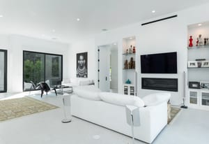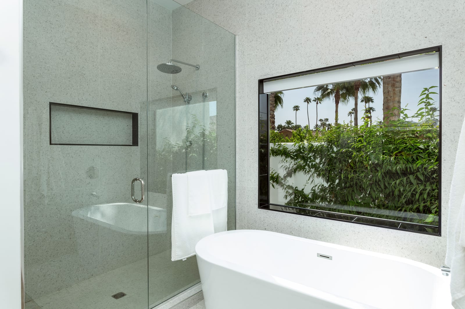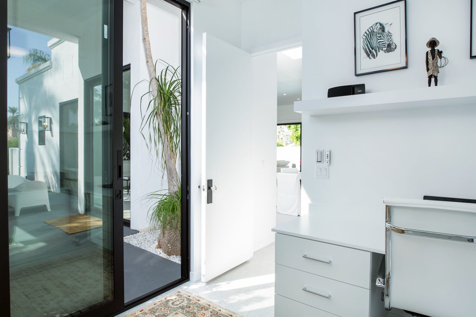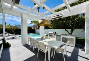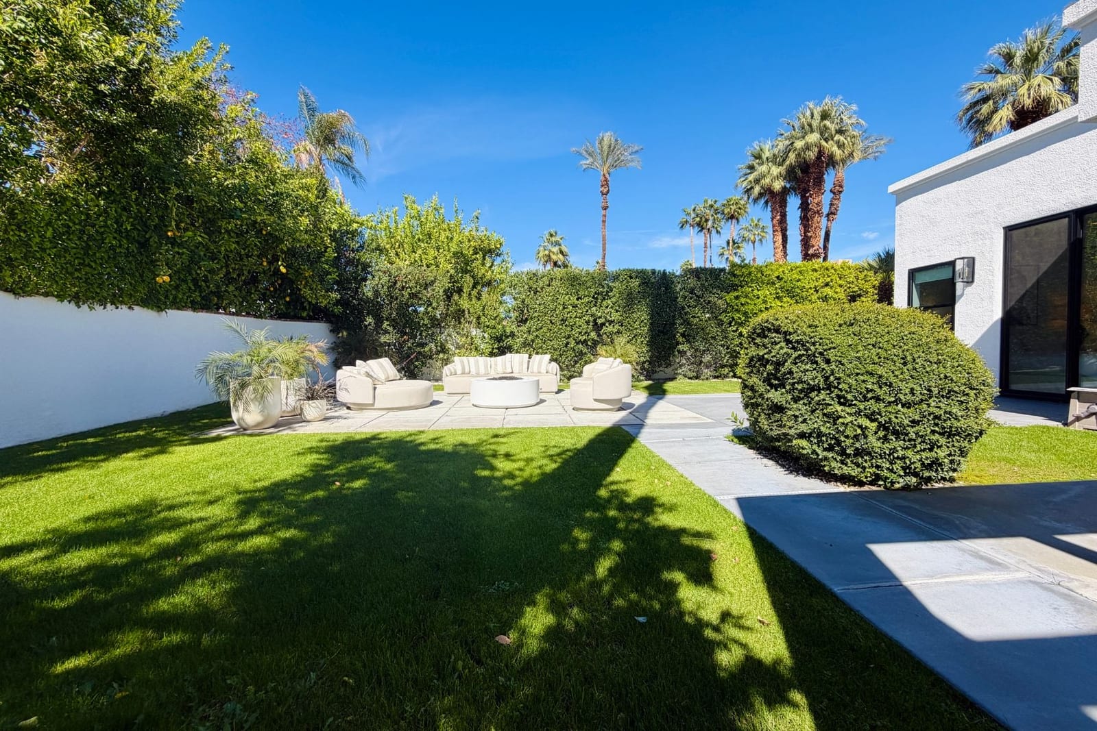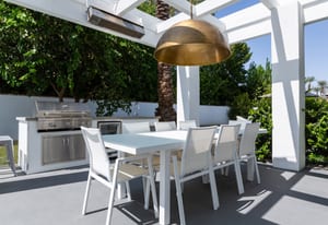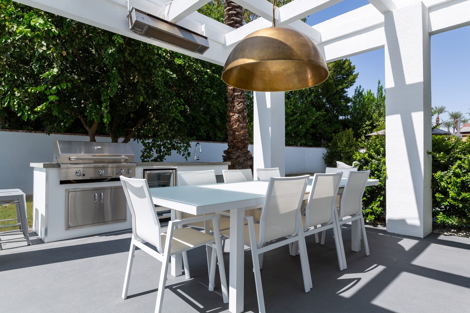 Outdoors, the home reveals its true character. A sculpted patio, outdoor kitchen, fire pit and overhead heaters create an environment equally suited to lively gatherings or tranquil desert nights beneath the stars.