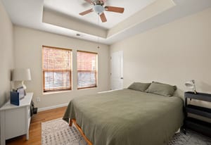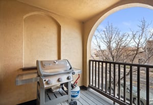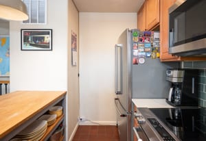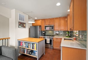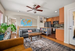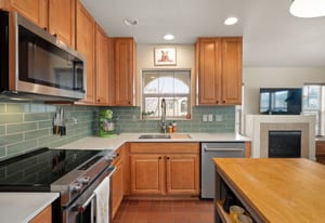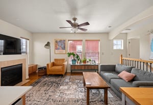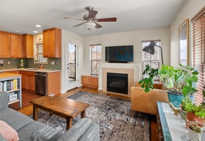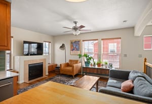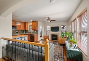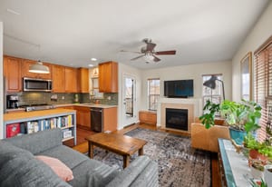 Upstairs, an open and airy living space unfolds. The remodeled kitchen makes a statement with quartz countertops, new stainless steel appliances, updated tile, and modern finishes completed in 2023–2024. The adjacent living room is warm and inviting, centered around a gas fireplace and filled with natural light, with seamless access to a private balcony ideal for grilling or relaxing outdoors.