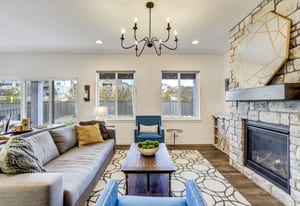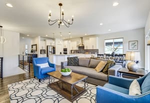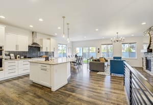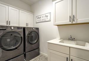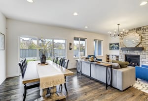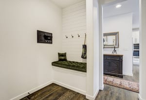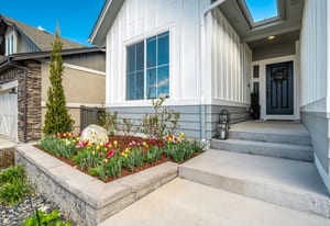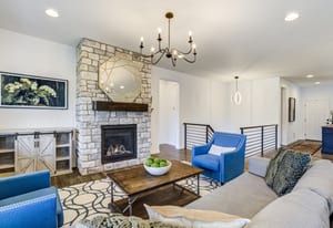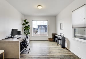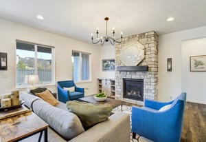 The open floor plan is designed for both comfortable living and effortless entertaining, featuring a spacious kitchen, dining area, and inviting living room anchored by a gas fireplace with stacked stone surround. The main-level primary suite offers a private retreat with a 5-piece en-suite bath, while additional main-level conveniences include a home office or flex space, laundry room with sink, mud room with coat hooks and built in boot-bench, and powder bath.