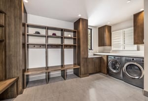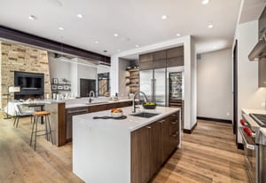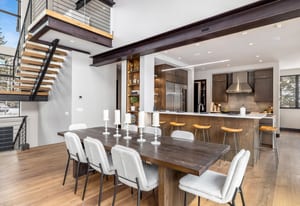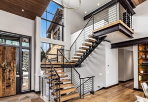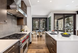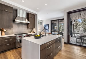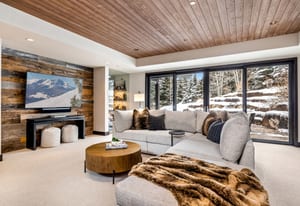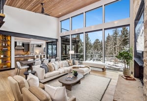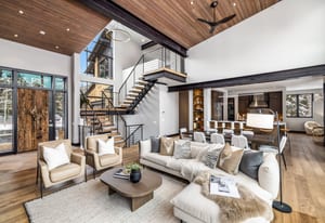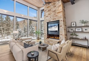 Designed by Berglund Architects and built by Vail Custom Builders in 2017, the home reflects contemporary alpine architecture with natural stone and wood siding beneath a durable metal roof. Inside, soaring vaulted ceilings and expansive windows frame mountain views and anchor the great room around a statement stone fireplace, creating an ideal setting for both entertaining and relaxed mountain living.