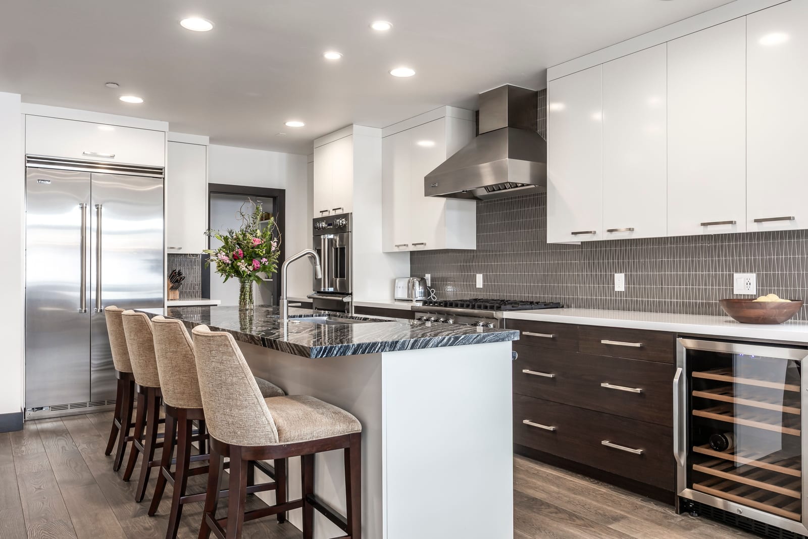 Exquisite finishes elevate every space, including solid white oak flooring, dramatic stacked-stone fireplaces, professional-grade Viking appliances, and designer fixtures by Kohler, Brizo, and Hansgrohe. The home is offered fully furnished with curated, high-end furnishings for immediate enjoyment.