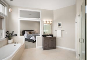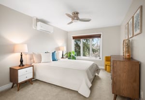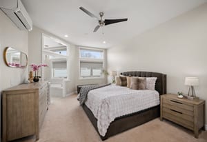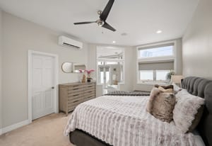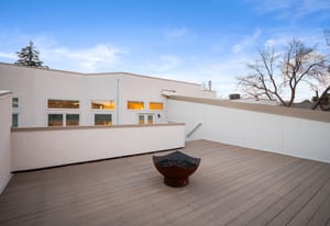 Upstairs, the primary suite is a true retreat with dual customized walk-in closets and a spa-inspired five-piece bath. French doors lead to a private rooftop deck with a firepit. A guest bedroom with ensuite provides comfort and scenic mountain views.