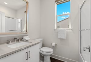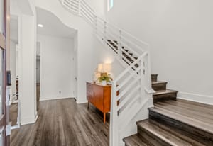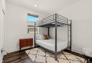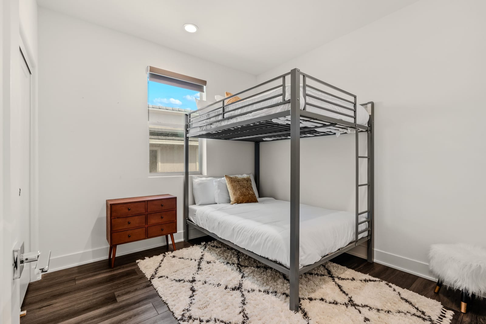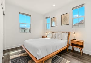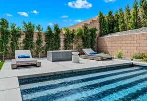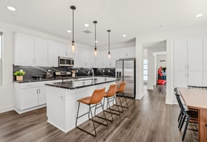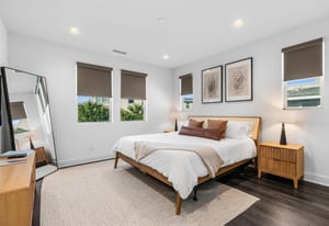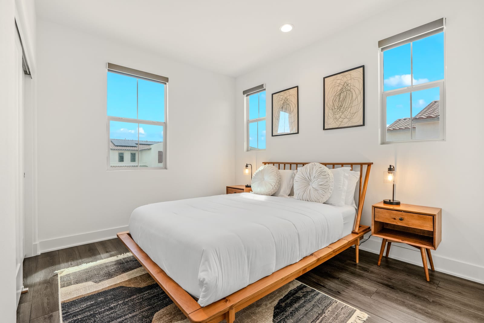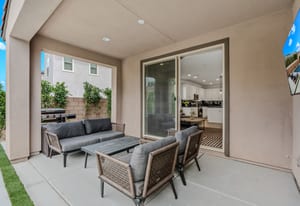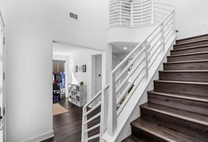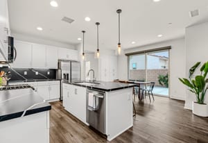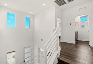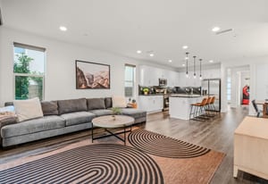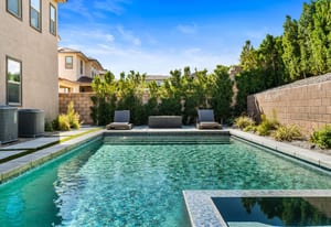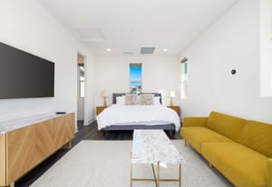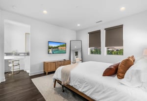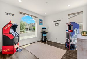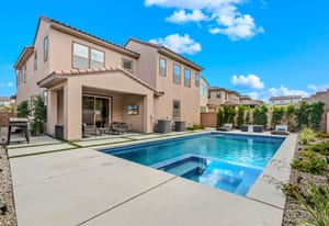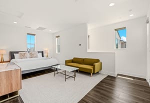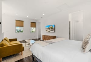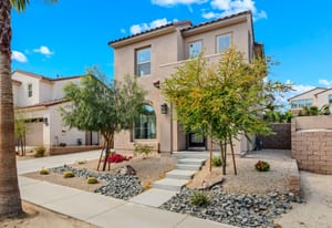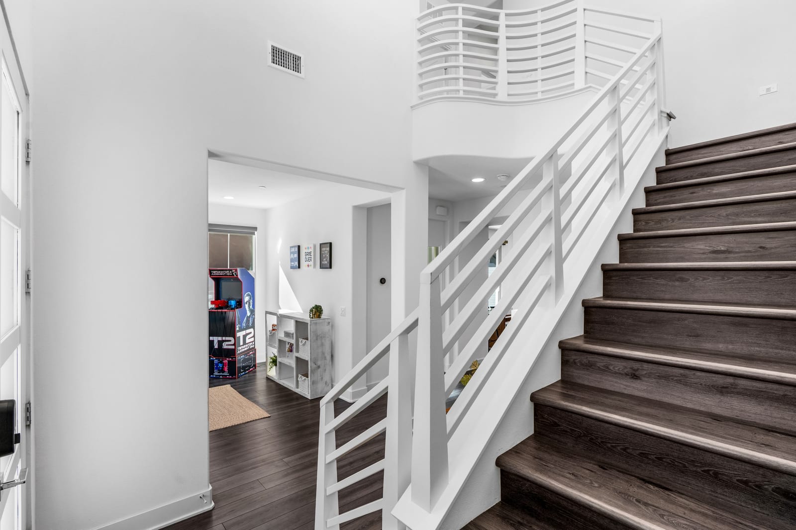 A study in modern desert elegance, this residence in Palm Desert's sought-after University Park community presents a seamless blend of clean architectural lines and vibrant contemporary design. The entry makes an immediate statement, as a dramatic staircase rises beneath soaring ceilings, its clean-lined railing tracing a bold architectural silhouette. Hardwood-style plank flooring grounds the main level, where linear sightlines and curated contrasts define the open-concept living spaces. The great room is both sophisticated and inviting, illuminated by sculptural LED lighting and seamlessly connected to the outdoors through broad expanses of glass. At the heart of the home, the kitchen makes a bold yet elegant statement. Striking black marble countertops anchor the space, complemented by stainless steel appliances and a streamlined breakfast bar island. Also on the main level, a flexible den currently styled as a game lounge offers versatility, ideal as a media room, creative studio, office, or additional gathering space. The 2nd level is entirely devoted to privacy and retreat. All four bedrooms are thoughtfully positioned upstairs, including a detached casita-style suite, uniquely elevated for added separation and quiet. A centrally located laundry room on the upper level adds practical refinement to daily life. Outdoors, the experience shifts to resort mode. A private pool and spa shimmer beneath expansive desert skies, framed by patio spaces designed for alfresco dining, sun soaked afternoons, and twilight gatherings. Life at University Park extends beyond the home itself, residents enjoy access to The Grove, a vibrant community hub featuring multiple resort pools and spas, pickleball and bocce courts, a fitness center, playground, outdoor cooking areas, and expansive event lawns. Moments from premier shopping, dining, golf, and parks, this home offers a refined yet effortless desert lifestyle. Home is being sold furnished and includes an owned solar system.